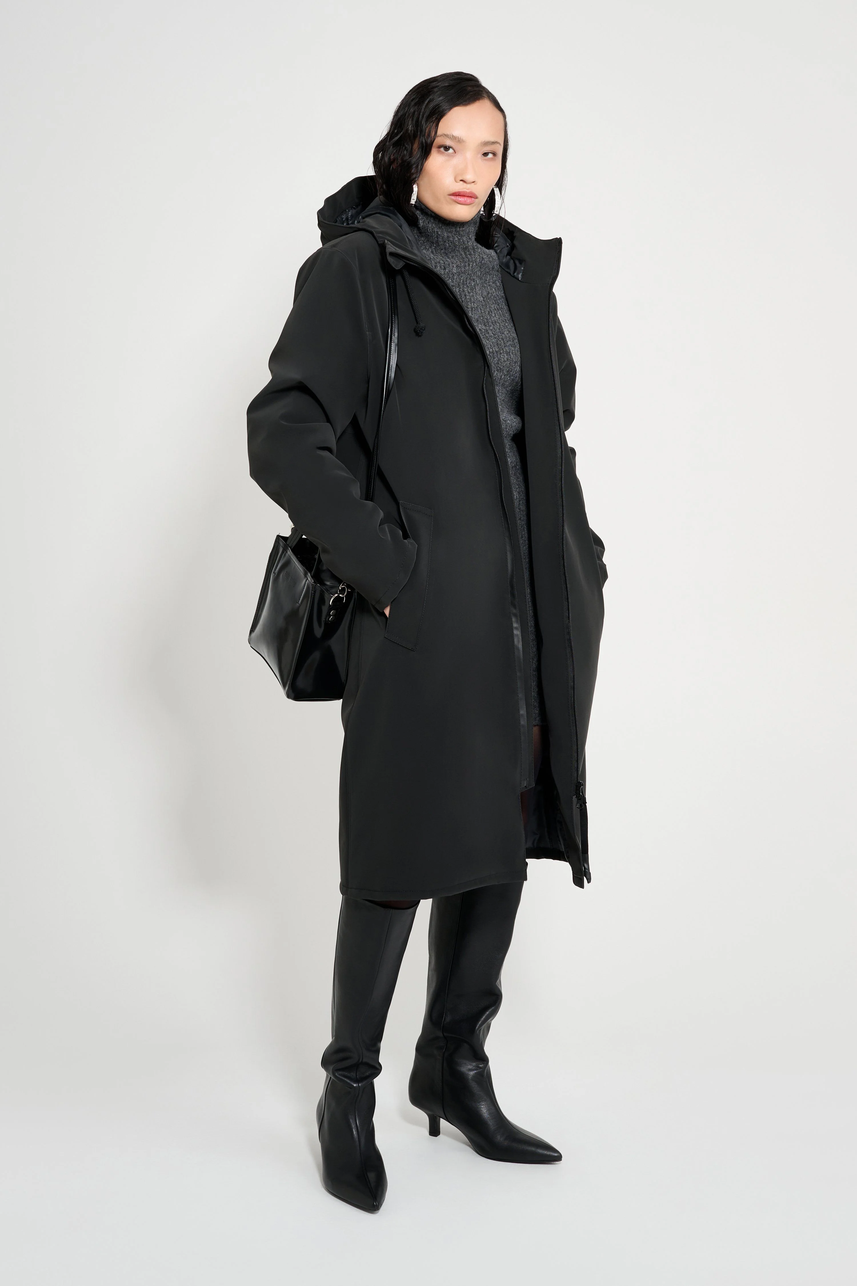 Stockholm Long Winter Matte is a straight-fit knee-length warm raincoat in sturdy and hard-wearing waterproof fabric with a matte-textured finish. It’s insulated with padding for warmth during the winter season. Expertly made, it’s tailored with double-welded seams for complete protection against rain and snow. The drawstring hood and knitted wristlets add ease of movement and comfort in uncomfortable weather. The model is 175 cm / 5'9" Wearing → SIZE XS GARMENT DETAILS - Midweight 280-gram shell fabric - Matte-textured finish - Completely waterproof - 150-gram technical insulator filling - Polyester lining - Straight unisex fit - Knee-length - Aqua guard zipper - Nylon logo pull tab - Drawstring hood - Knitted wristlets - Fleece-lined welt side pockets - Fleece-lined inside welt pocket - Double welded seams - +20 000 mm water column pressure - Designed in Stockholm - Made in Europe MATERIAL Coating: 100% PVC rubberized coating Membrane: 100% polyester Lining: 100% polyester with poly filling Read more about our fabrics