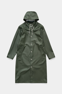 Stockholm Long is a straight-fit knee-length raincoat in sturdy and hard-wearing waterproof fabric. Expertly made, it’s tailored with double-welded seams for complete protection against the rain. The drawstring hood and under-arm eyelets add ease of movement and comfort in uncomfortable weather. GARMENT DETAILS - Mid-weight 380-gram fabric - Completely waterproof - Straight unisex fit - Knee-length - Snap metal button closures - Drawstring hood - Open welt pockets - Double welded seams - Under-arm eyelets for ventilation - +20 000 mm water column pressure - Designed in Stockholm - Made in Europe MATERIAL Coating: 100% PVC rubberized coating Membrane: 52% cotton, 48% polyester Read more about our fabrics
