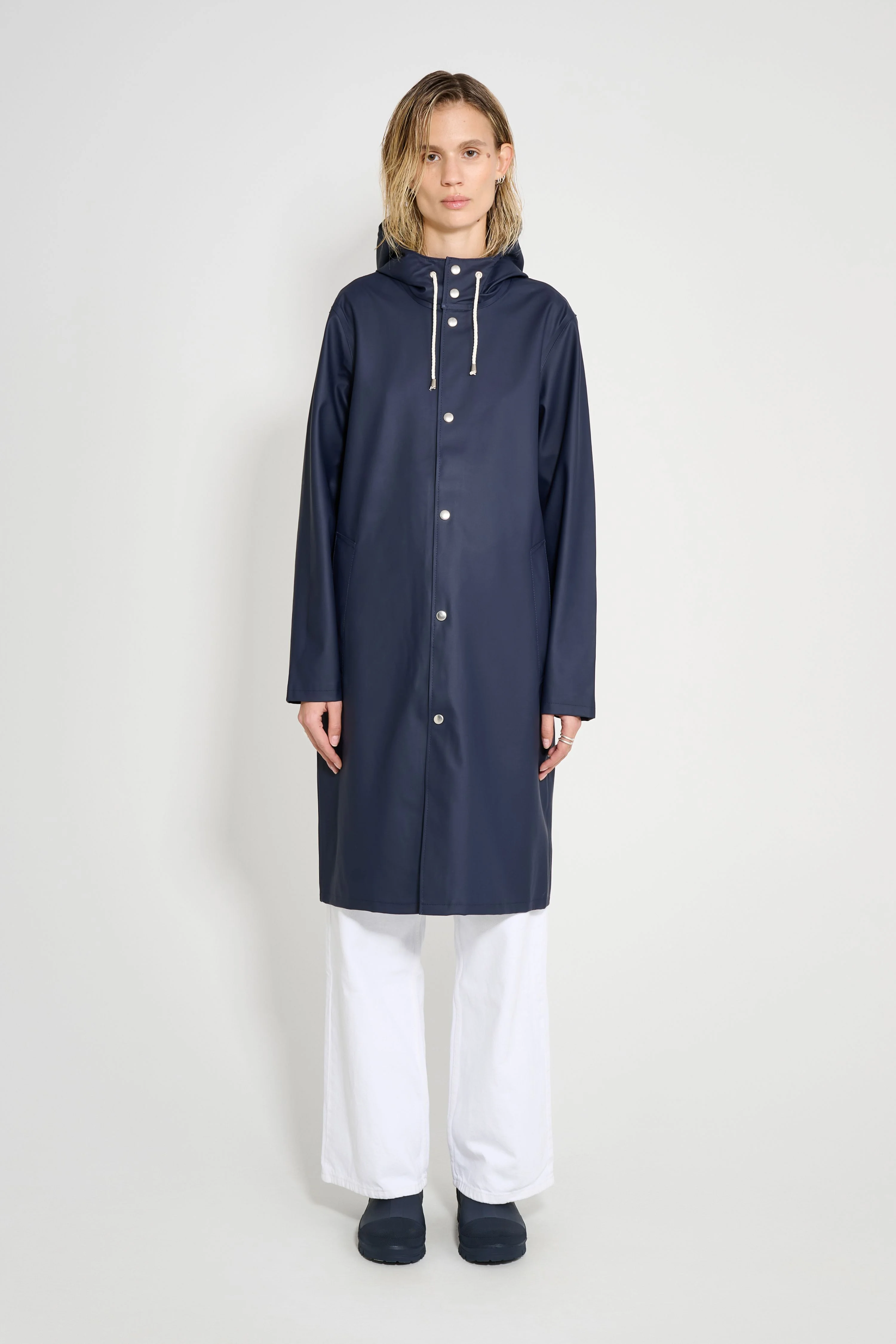 Stockholm Long is a straight-fit knee-length raincoat in sturdy and hard-wearing waterproof fabric. Expertly made, it’s tailored with double-welded seams for complete protection against the rain. The drawstring hood and under-arm eyelets add ease of movement and comfort in uncomfortable weather. The model is 175 cm / 5′ 9” Wearing → SIZE XS GARMENT DETAILS - Mid-weight 380-gram fabric - Completely waterproof - Straight unisex fit - Knee-length - Snap metal button closures - Drawstring hood - Open welt pockets - Double welded seams - Under-arm eyelets for ventilation - +20 000 mm water column pressure - Designed in Stockholm - Made in Europe MATERIAL Coating: 100% PVC rubberized coating Membrane: 52% cotton, 48% polyester Read more about our fabrics