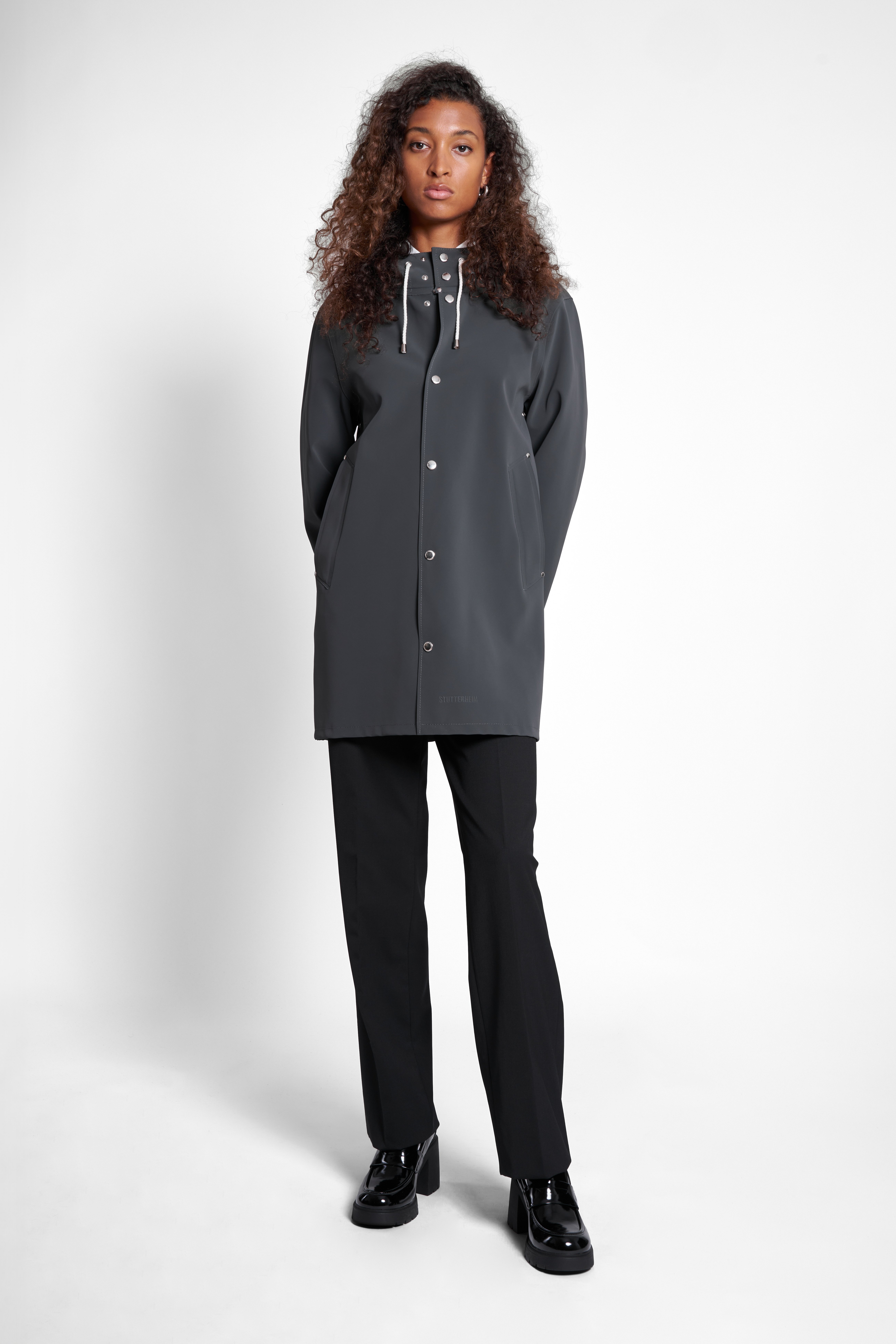 Stockholm Matte is a straight-fit raincoat in a matte textured finish waterproof fabric. Expertly made, it’s tailored with double-welded seams for complete protection against the rain. The drawstring hood and under-arm eyelets add ease of movement and comfort in uncomfortable weather. The model is 178 cm / 5′ 10″ Wearing → SIZE XS GARMENT DETAILS • Heavyweight 530-gram fabric • Matte textured finish • Completely waterproof • Straight unisex fit • Snap metal button closures • Drawstring hood • Open welt pockets • Double welded seams • Under-arm eyelets for ventilation • +20 000 mm water column pressure • Designed in Stockholm • Made in Europe MATERIAL Coating: 100% PVC rubberized coating Membrane: 52% cotton, 48% polyester Read more about our fabrics