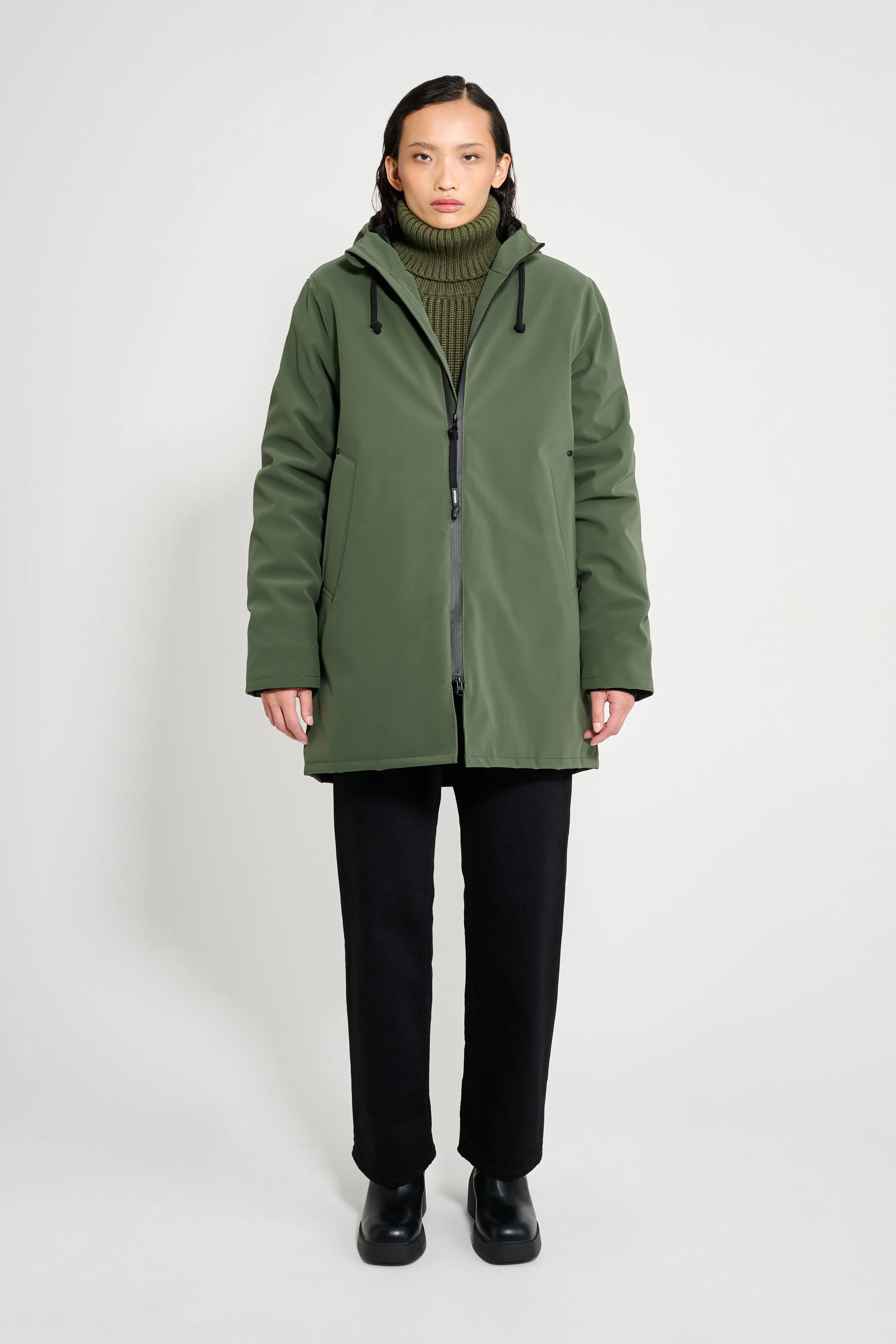 Stockholm Winter Matte is a straight-fit warm raincoat in sturdy and hard-wearing waterproof fabric with a matte-textured finish. It’s insulated with padding for warmth during the winter season. Expertly made, it’s tailored with double-welded seams for complete protection against rain and snow. The drawstring hood and knitted wristlets add ease of movement and comfort in uncomfortable weather. The model is 170 cm / 5'6" Wearing → SIZE XS GARMENT DETAILS - Midweight 280-gram shell fabric - Matte-textured finish - Completely waterproof - 150-gram technical insulator filling - Polyester lining - Straight unisex fit - Aqua guard zipper - Nylon logo pull tab - Drawstring hood - Knitted wristlets - Fleece-lined welt side pockets - Fleece-lined inside welt pocket - Double welded seams - +20 000 mm water column pressure - Designed in Stockholm - Made in Europe MATERIAL Coating: 100% PVC rubberized coating Membrane: 100% polyester Lining: 100% polyester with poly filling Read more about our fabrics