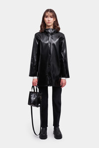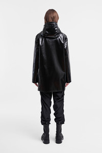 Stockholm Opal is a straight-fit raincoat in shiny yet sturdy waterproof fabric. Expertly made, it’s tailored with double-welded seams for complete protection against the rain. The drawstring hood and under-arm eyelets add ease of movement and comfort in uncomfortable weather. The model is 175 cm / 5′ 9” Wearing → SIZE XS GARMENT DETAILS - Heavy-weight 530-gram fabric - Shiny high-gloss fabric finish - Completely waterproof - Straight unisex fit - Snap metal button closures - Drawstring hood - Open welt pockets - Double welded seams - Under-arm eyelets for ventilation - +20 000 mm water column pressure - Designed in Stockholm - Made in Europe MATERIAL Coating: 100% PVC rubberized coating Membrane: 52% cotton, 48% polyester Read more about our fabrics