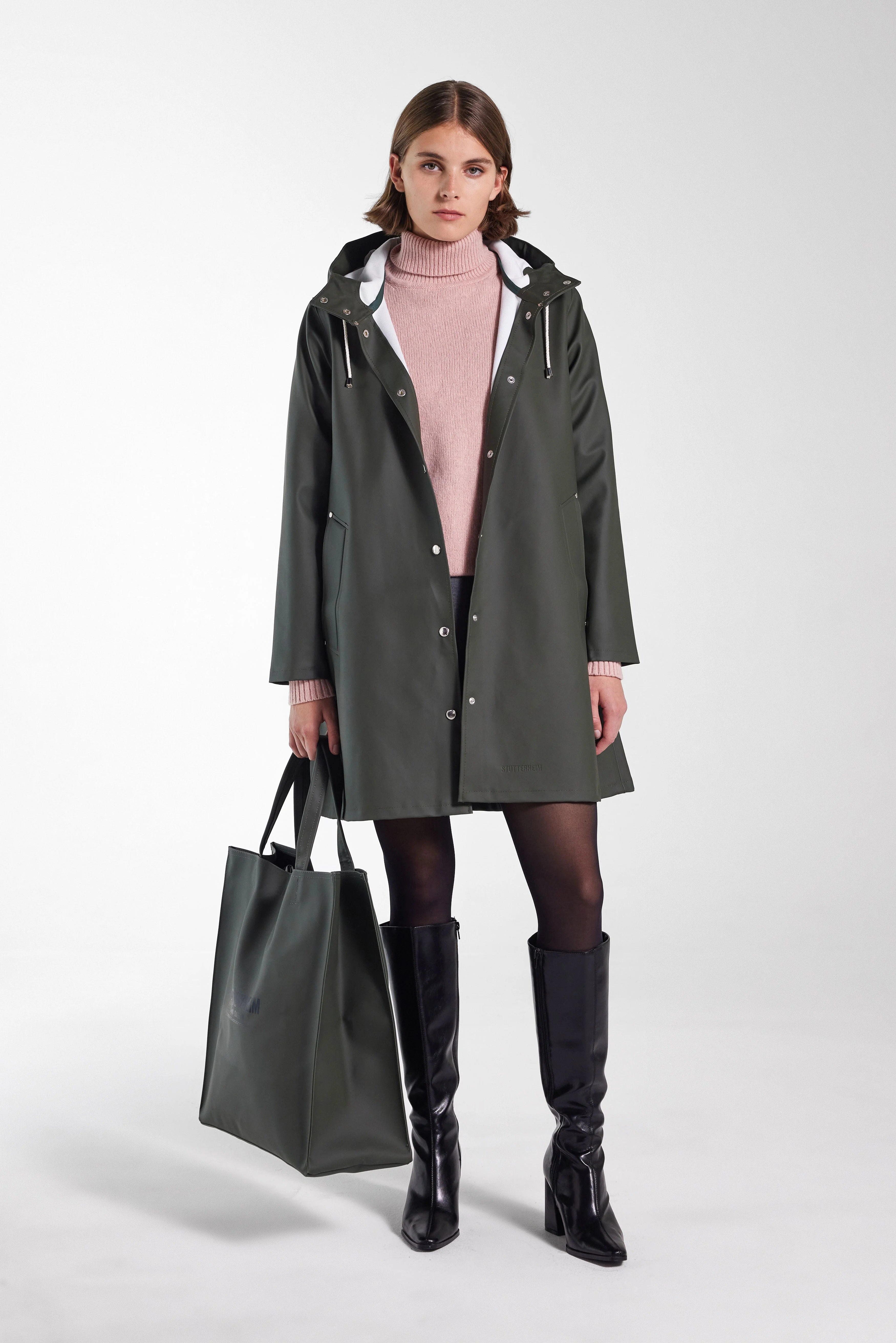 Mosebacke, a hilltop overlooking Stockholm and your top wardrobe staple, is an artisanally made a-line-shaped raincoat for women. The sturdy and hard-wearing waterproof fabric is tailored with double-welded seams, making it impossible for any moisture to seep through. Ease of movement and comfort is achieved with under-arm eyelets and a drawstring hood. The model is 179 cm / 5′ 10″ Wearing → SIZE S GARMENT DETAILS • Heavy-weight 530-gram fabric • Completely waterproof • A-line silhouette • Snap metal button closures • Drawstring hood • Open welt pockets • Double welded seams • Under-arm eyelets for ventilation • +20 000 mm water column pressure • Designed in Stockholm • Made in Europe MATERIAL Coating: 100% PVC rubberized coating Membrane: 52% cotton, 48% polyester Read more about our fabrics