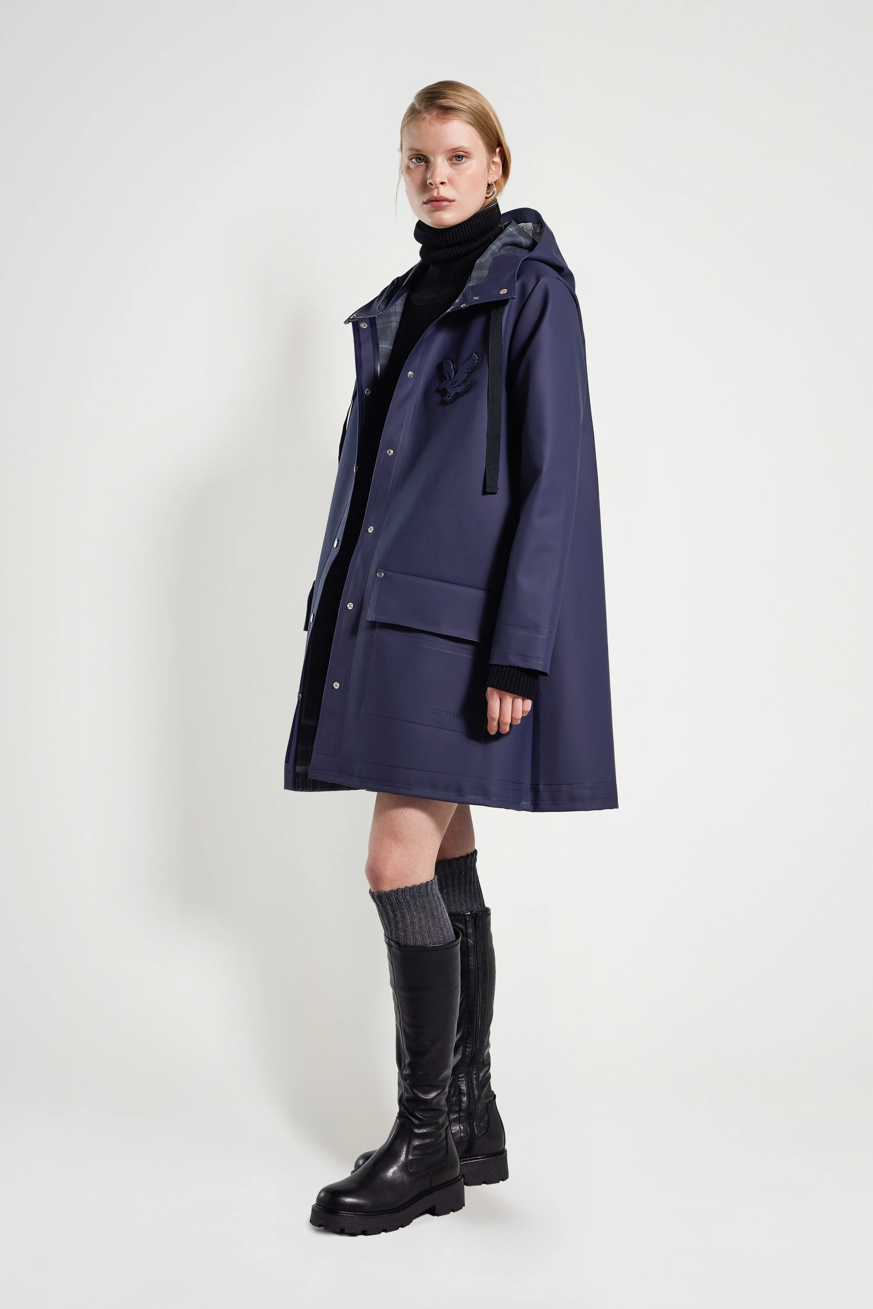 The Lyle & Scott version of our classic Mosebacke raincoat is an artisanally made A-line coat for women featuring a chunky tone-in-tone Golden Eagle rubber patch on the chest and Lyle & Scott's 150th jubilee tartan on the inside lining. The sturdy and hard-wearing waterproof exterior fabric is tailored with double-welded seams, making it impossible for any moisture to seep through. Ease of movement and comfort are achieved with underarm eyelets and a drawstring hood. The model is 175 cm / 5′ 9” Wearing → SIZE S GARMENT DETAILS - Heavyweight 530-gram fabric - Completely waterproof - Tone-in-tone Golden Eagle rubber on chest - Lined with Lyle & Scott 150th jubilee tartan - A-line silhouette - Snap metal button closures - Drawstring hood with black webbing tapes - Patch pockets with lid - Double-welded seams - Underarm eyelets for ventilation - +20 000 mm water column pressure - Designed in Stockholm - Made in Europe MATERIAL Coating: 100% PVC rubberized coating Membrane: 52% cotton, 48% polyester Read more about our fabrics