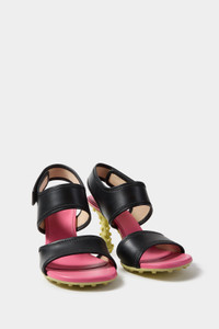 Heel sandals featuring studs on outsole and heels. Black leather fabric with fuchsia outsole with logo. Back adjustable velcro fastening. 100% CALF LH 100%TPU Materials from Italy Made in Italy