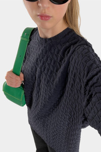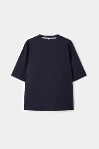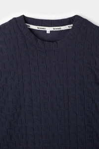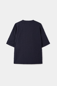 Dark navy crewneck t-shirt with allover jacquard logo and short sleeves. 95% PA – 5% EA Made in Portugal Material from Portugal Isabel is 180cm tall and she is wearing a size S.
