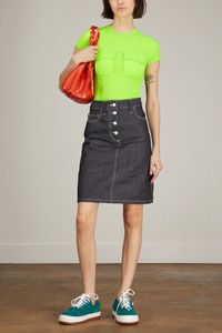The Sunnei Belli Dentro Short Skirt in Dark Denim is a five pocket short skirt in dark navy denim with white printed stripes on the inside. Features a button fly closure on the front. - 100% Cotton - Made in Italy
