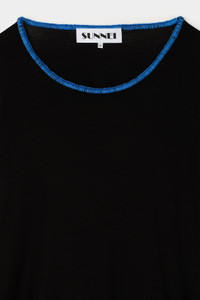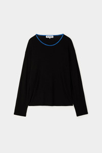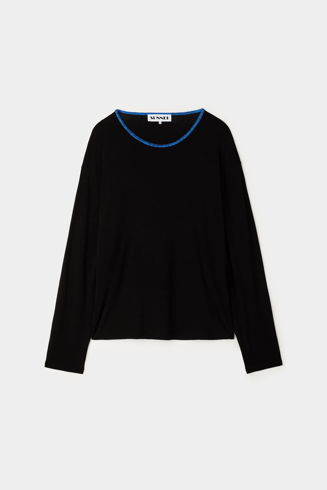 Longsleeve fit t-shirt in light wool merino black jersey with rib collar and electic blue contrast overlock embroidery along collar neck. 86% MERINO WO 9.5% PA 4.5% EA Materials from Portugal Made in Portugal