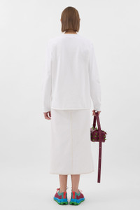 White garment-dyed classic-fit crewneck longsleeve t-shirt featuring piping on collar and hems and SUNNEI gros grain on front bottom left. 100% CO Materials from Portugal Made in Portugal Bruna is wearing a size S. Model measures: Height: 177cm Chest: 81cm Waist: 61cm Hips: 89cm Shoe: 39
