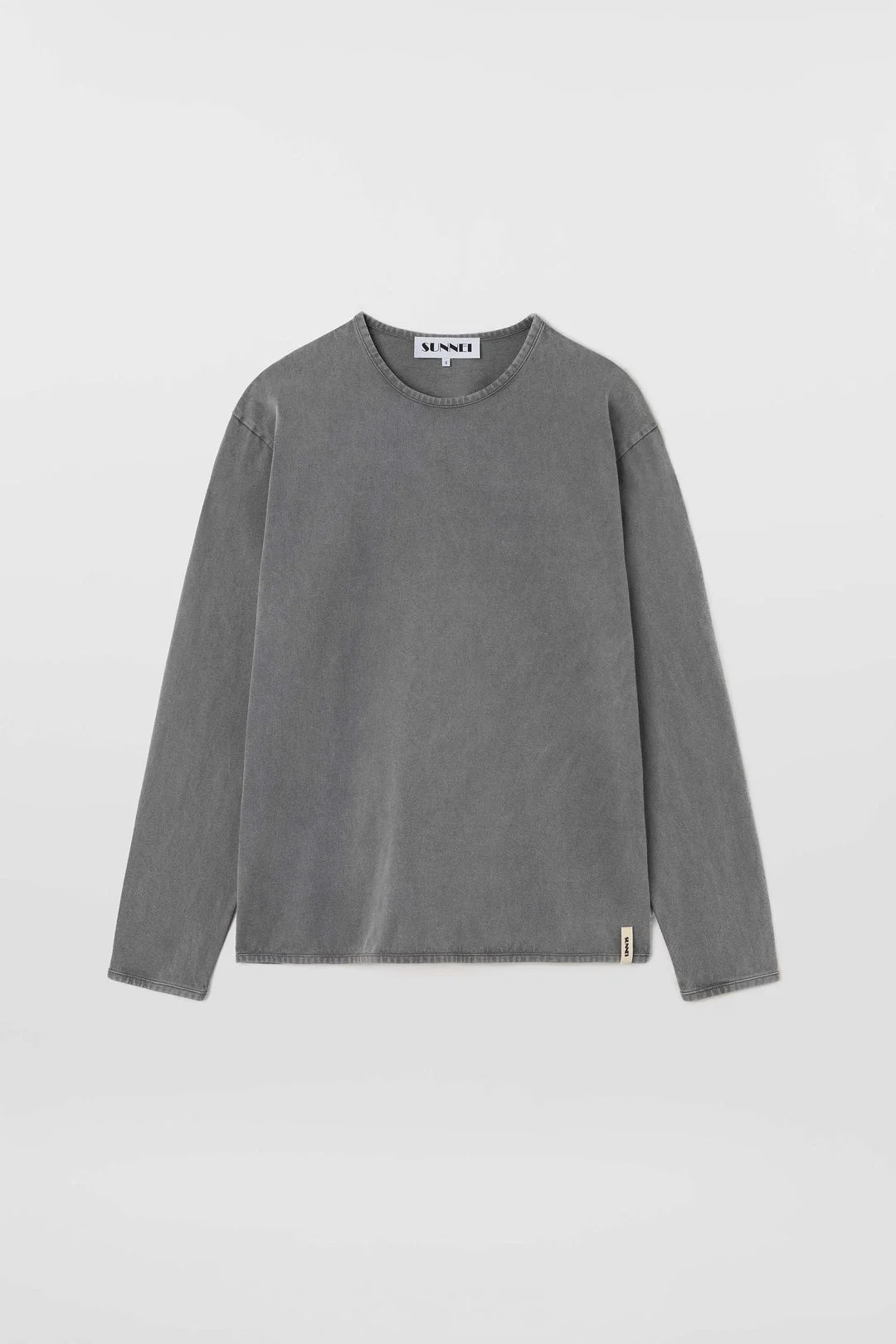 Anthracite garment-dyed classic-fit crewneck longsleeve t-shirt featuring piping on collar and hems and SUNNEI gros grain on front bottom left. 100% CO Materials from Portugal Made in Portugal