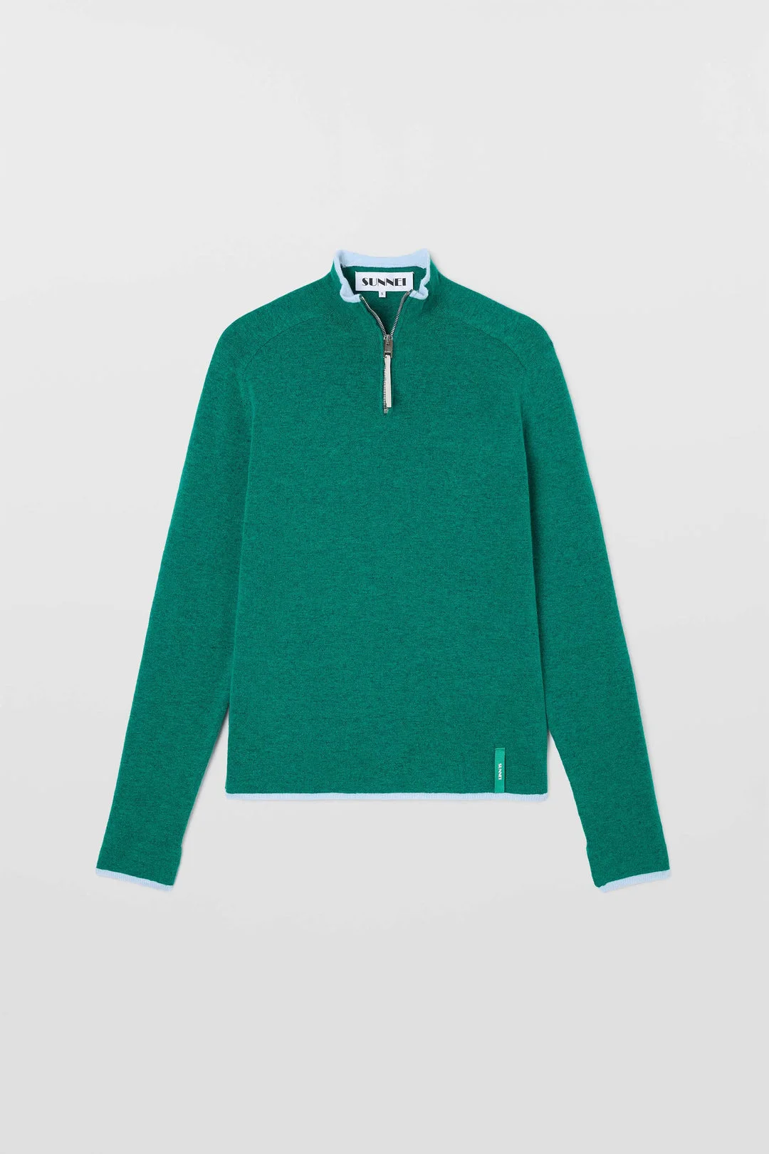 Raglan highneck longsleeve fitted top featuring green cashmere and merino wool blend with contrast edges on top collar, bottom sleeve, and hem and SUNNEI branded gros gain on bottom left loop. 5% CASHMERE 10% EXTRAFINE MERINO WOOL 23%VI 59%PA 3%EA Made in China