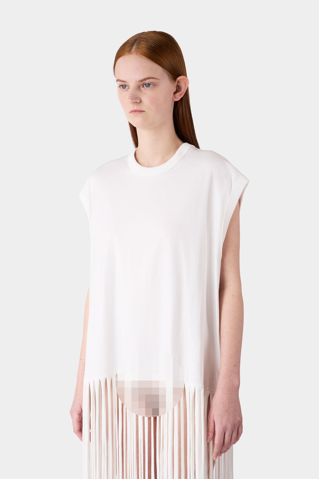 Tank top with long fringes in off white light jersey. 100% Organic CO Materials from Italy Made in Italy Chloe is wearing S. Model measures: Height: 176 cm Chest: 78 Waist: 60 Hips: 87 Shoe: 40 Chloe is wearing S. Model measures: Height: 176 cm Chest: 78 Waist: 60 Hips: 87 Shoe: 40