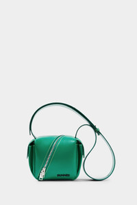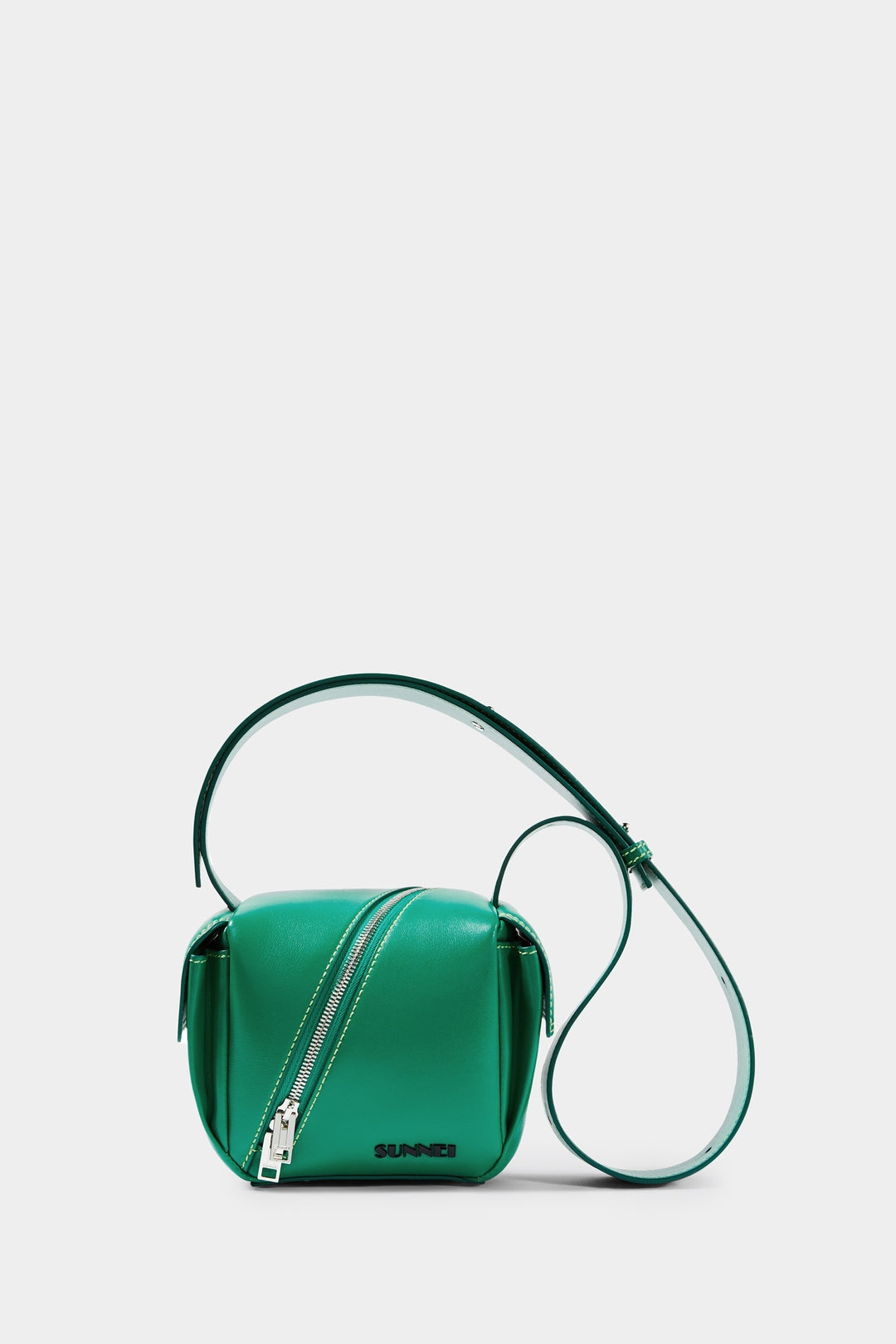 Cubic bag in green calf leather with diagonal double way zip closure and adjustable shoulder strap. Two side pockets with magnetic closures. Acid green contrast stitching and black metallic logo on the front. Internal canvas lining.Bag size: L: 17cm W: 13cm H: 15cm Shoulder strap drop: min 16cm — max 47cm 100%LE 100%CO Materials from Italy Made in Italy