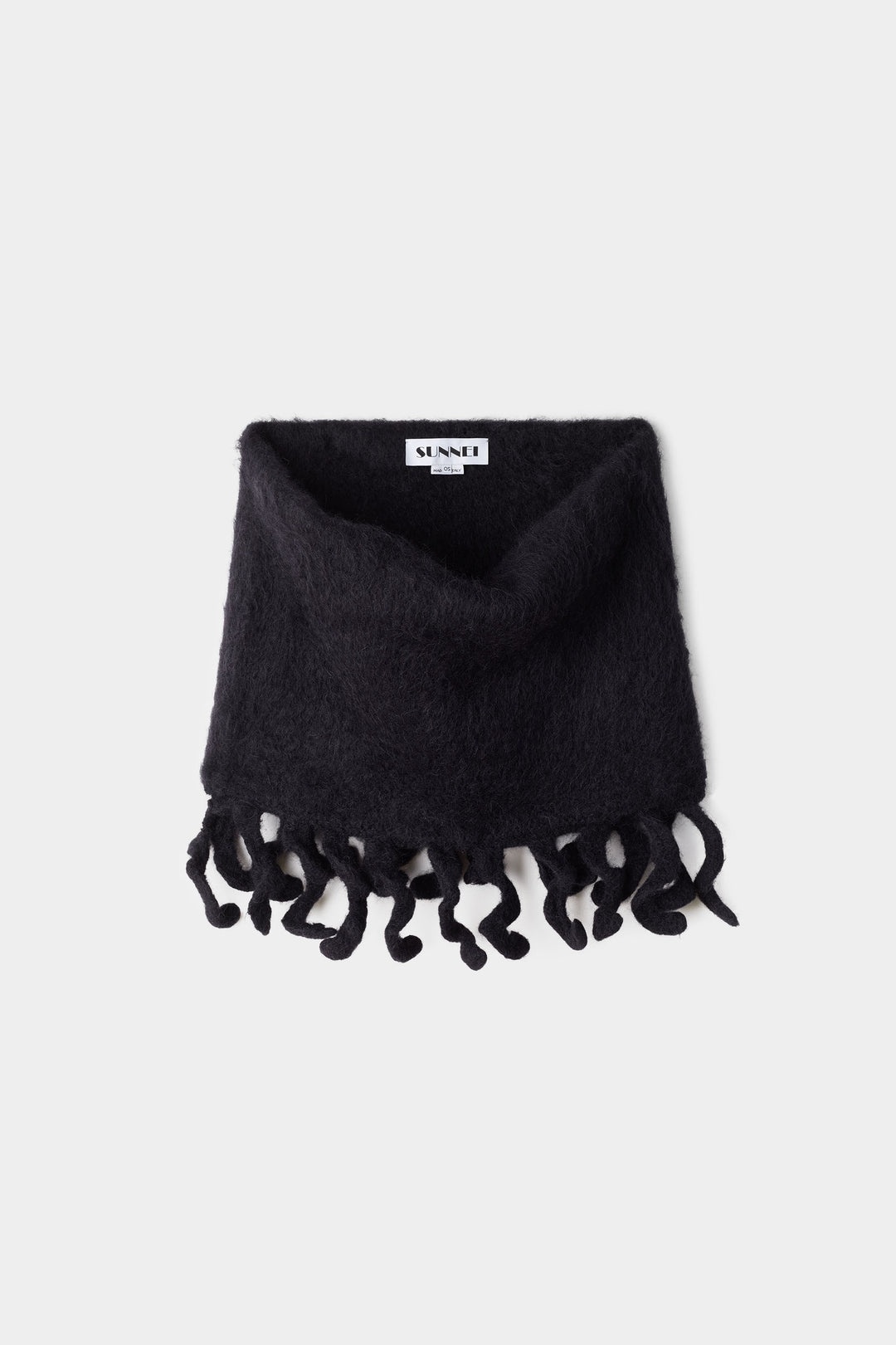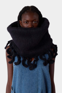 Hairy black knit scarf with chunky spirals on bottom hem 41% Alpaca Superfine 41% Mohair Kid 16%PA 2% EA Materials from Italy Made in Italy