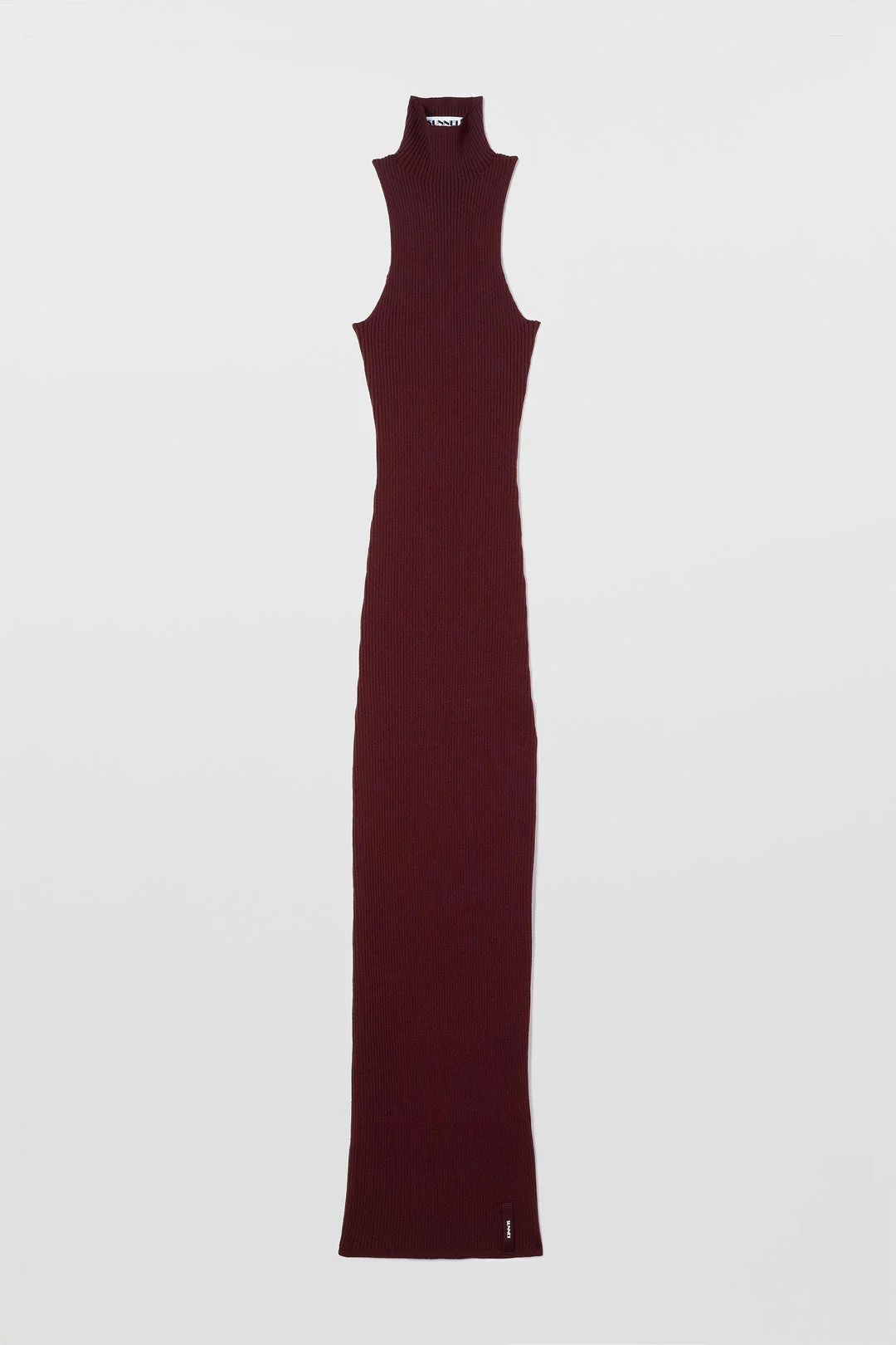 Sleeveless highneck fitted dress made with vanise technical fabric featuring dark aubergine & orange bicolour yarn and SUNNEI branded gros gain on bottom left. 59%PA 36.9%PL 4.1%EA Sophie is wearing a size S. Model measures: Height: 176 cm Chest: 81 cm Waist: 60 cm Hips: 92 cm