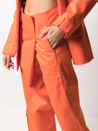 high-waisted wide trousers orange high-waisted wide leg concealed front fastening two side inset pockets two rear patch pockets Made in Italy Composition Polyester 65%, Cotton 35% SIZE & FIT Model measurements Height 5 ft 9 in(1.74 m) Bust/Chest 32.28 in(82 cm) Hips 35.82 in(91 cm) Waist 24.01 in(61 cm) FittingInformation This piece fits true to size. We recommend you get your regular size Designed to be fitted at the waist and hips, loose over the leg Made with a mid-weight non-stretch fabric