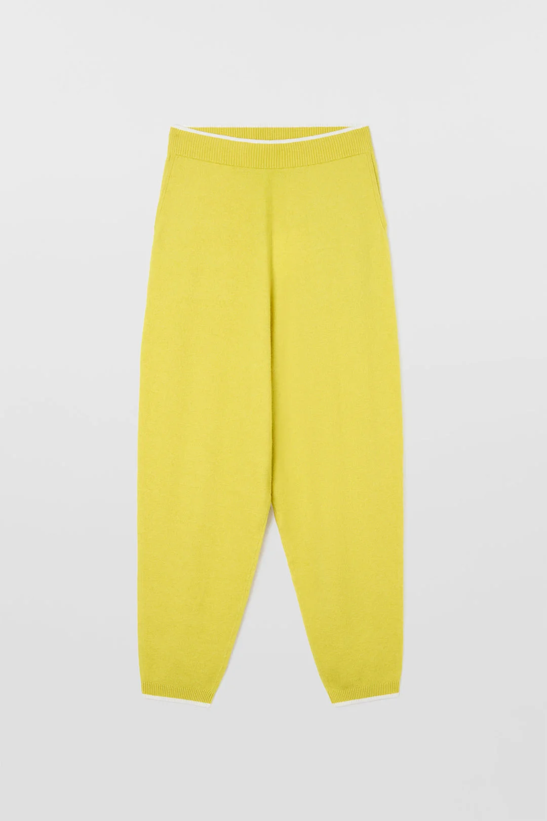 Elastic loose fit knit pants featuring chartreuse cashmere and merino wool blend with coulisse on waist, contrast edges on top waist and bottom hem, and SUNNEI branded gros gain on back right loop. 5% CASHMERE 10% EXTRAFINE MERINO WOOL 23%VI 59%PA 3%EA
