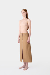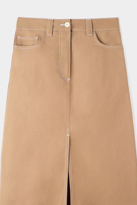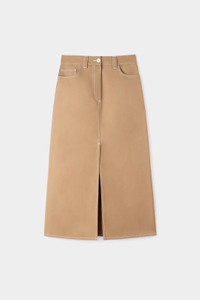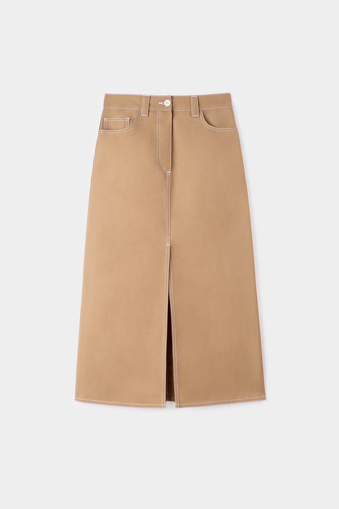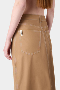 Long skirt with split at front in dark beige water-repellent cotton featuring contrast topstiching and shank T-front closure. 64%CO 36%PA Materials from Italy Made in Italy Chloe is wearing S. Model measures: Height: 176 cm Chest: 78 Waist: 60 Hips: 87 Shoe: 40 Chloe is wearing S. Model measures: Height: 176 cm Chest: 78 Waist: 60 Hips: 87 Shoe: 40
