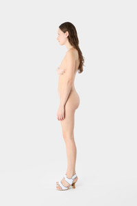 Heel sandals featuring studs on outsole and heels. Padded white fabric with grey contrast edges and white decorative stitchings. Back adjustable velcro fastening. Caramel outsole with logo. 80% PA — 20% EA / 100%TPU Materials from Italy Made in Italy