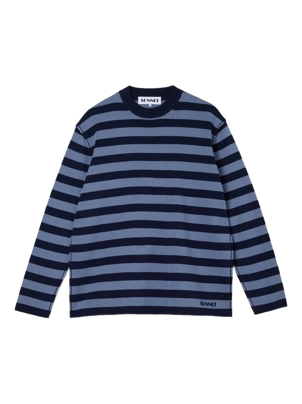 organic cotton striped sweater Highlights - Blue - Crew neck - Long sleeves - Embroidered logo to the front - Straight hem Imported Composition Combed Cotton 100% Washing instructions Read Manufacturer Guidelines