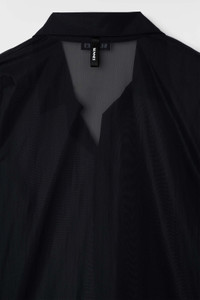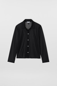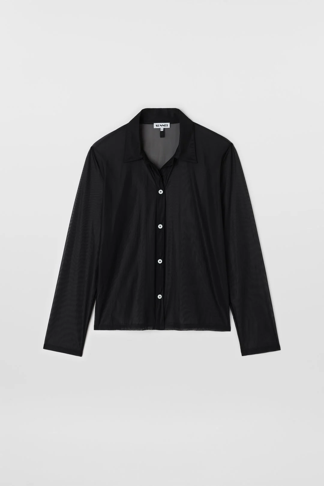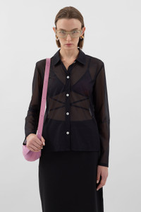 Longsleeve fitted shirt in black sheer oraganza featuring mother pearl buttons and SUNNEI gros grain on the centre back. 75%PA 25%EA Materials from Italy Made in Italy Bruna is wearing a size S. Model measures: Height: 177cm Chest: 81cm Waist: 61cm Hips: 89cm Shoe: 39