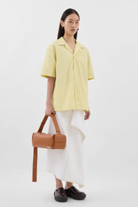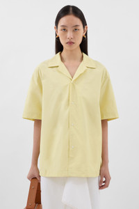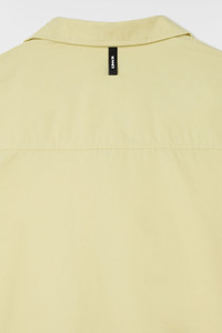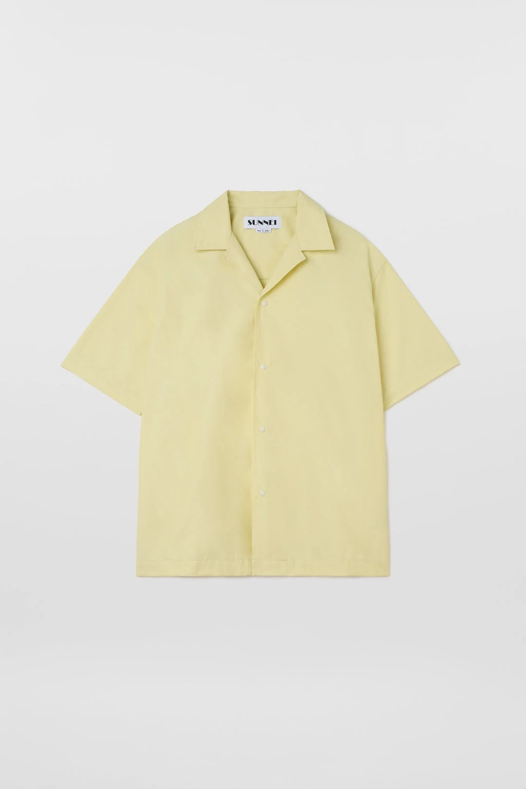 Over-fit shortsleeve shirt featuring light yellow compact poplin base and SUNNEI logo gros grain loop at the back. 64%CO 36%PA Materials from Portugal Made in Portugal