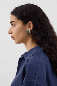 Single gold plated earring crafted in form and shape of the exclusive SUNNEI's RUBBERIZED earrings, featuring a dripping drop varnished in green matte hue. Size: 18 MM This earring is sold individually. Exterior: 100%BRASS Materials from Italy Made in Italy