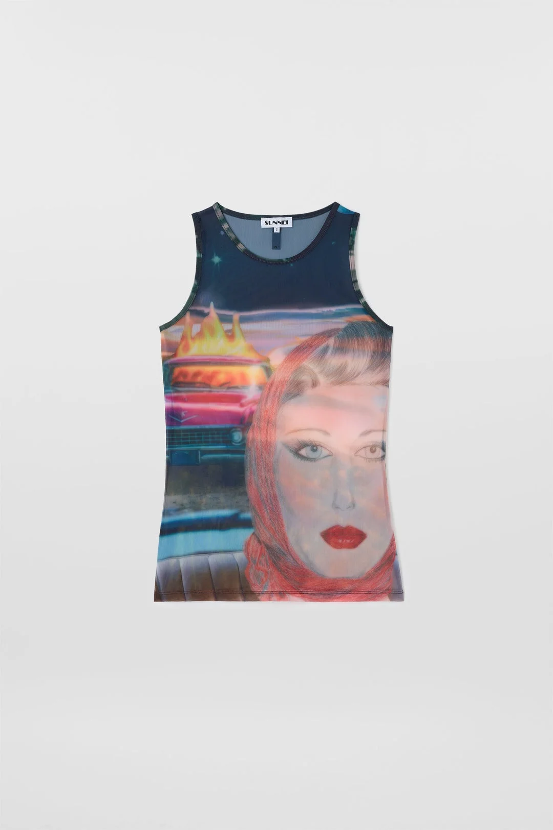 Sleeveless roundneck fitted top in multicolor sheer organza with seasonal Annemarie print and SUNNEI gros grain on the centre back. 75%PA 25%EA Materials from Portugal Made in Portugal Chol is wearing a size S. Model measures: Height: 180cm Chest: 79cm Waist: 61cm Hips: 90cm Shoe: 39