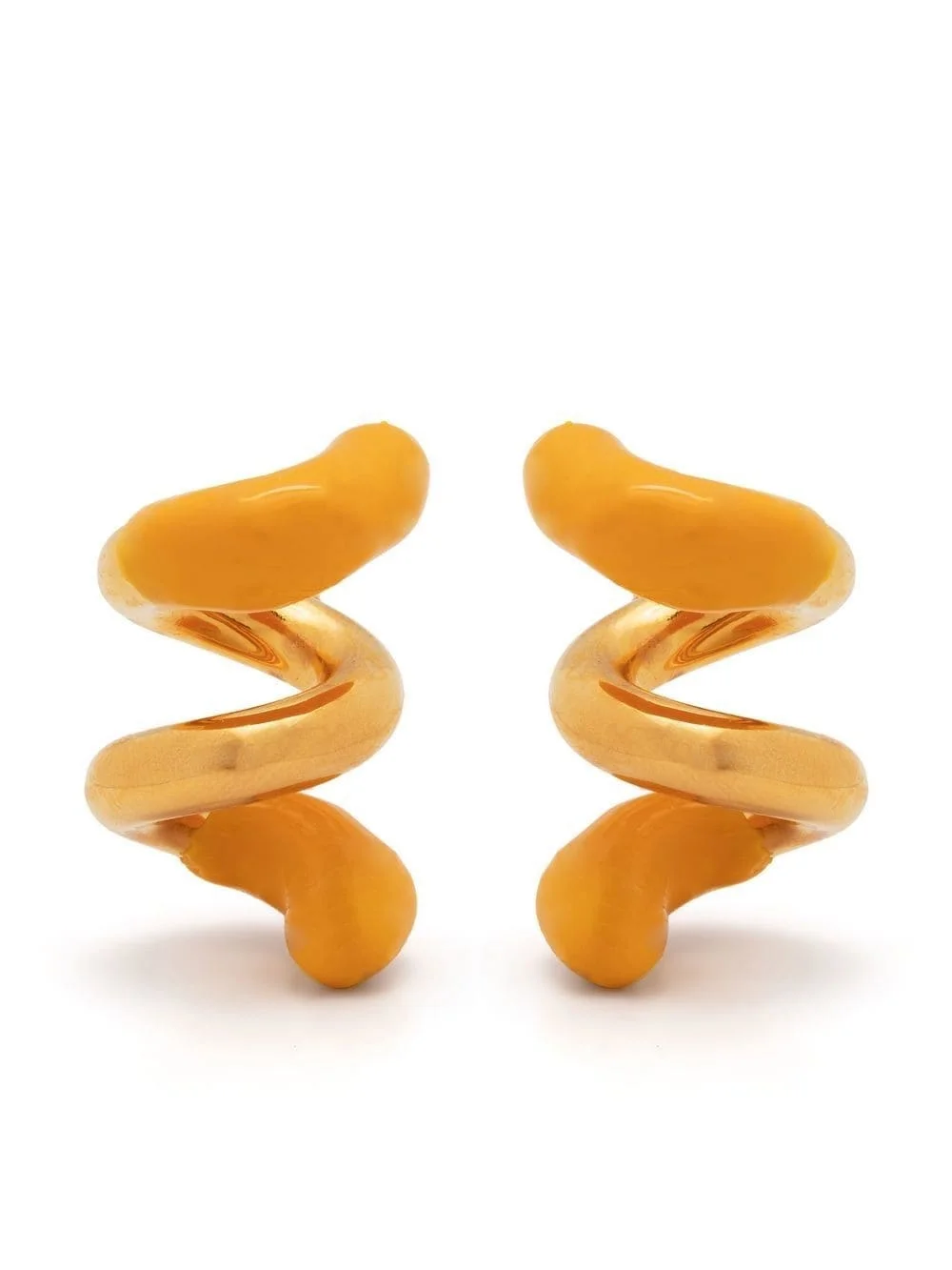 small rubberized curly earrings carrot orange/gold medium hoop design two-tone design These earrings come as a pair. Made in Italy SIZE & FIT Model measurements Height 5 ft 10 in(1.78 m) Bust/Chest 33.07 in(84 cm) Hips 36.61 in(93 cm) Waist 24.8 in(63 cm) Measurement HEIGHT 1.25 in(3.2 cm) Weight (single earring) 12 g(12 g) WIDTH 0.78 in(2 cm)