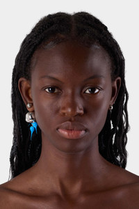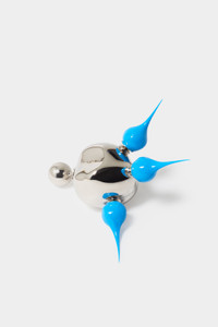 Asymmetrical palladium plated pair of earrings featuring small sphere with branded closure, and big organic branded sphere with handmade turquoise spike silicon extentions. 2,5cm x 6,5cm Exterior: 100% COPPER / Exterior trims: 100% BR / Coating: 100% EL Materials from Italy Made in Italy