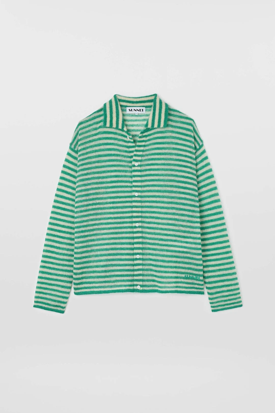 Straight-fit polo cardigan in light mixed mohair yarn featuring SUNNEI embroidery on the bottom left. 30%WM 30%WO 40%PA Chol is wearing a size S. Model measures: Height: 180cm Chest: 79cm Waist: 61cm Hips: 90cm Shoe: 39