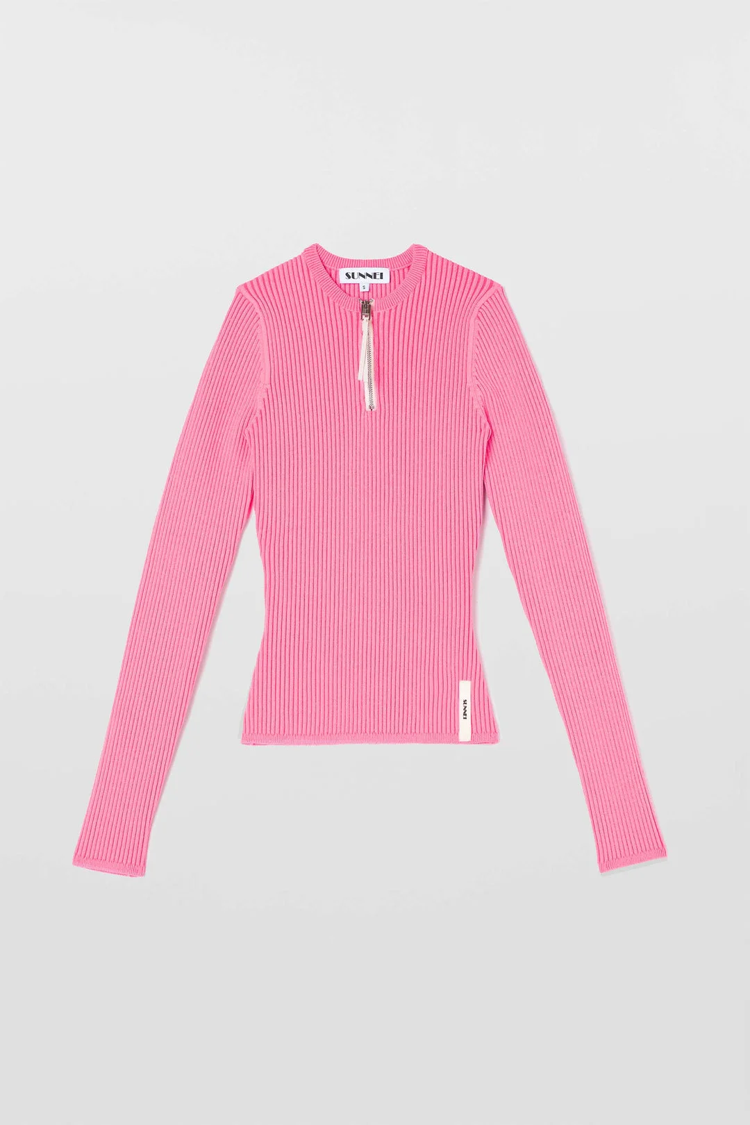 Longsleeve fitted roundneck top made with vanise technical fabric featuring electric pink bicolour yarn, SUNNEI branded puller, and gros grain on back right loop. 59%PA 36.9%PL 4.1%EA Sophie is wearing a size S. Model measures: Height: 176 cm Chest: 81 cm Waist: 60 cm Hips: 92 cm