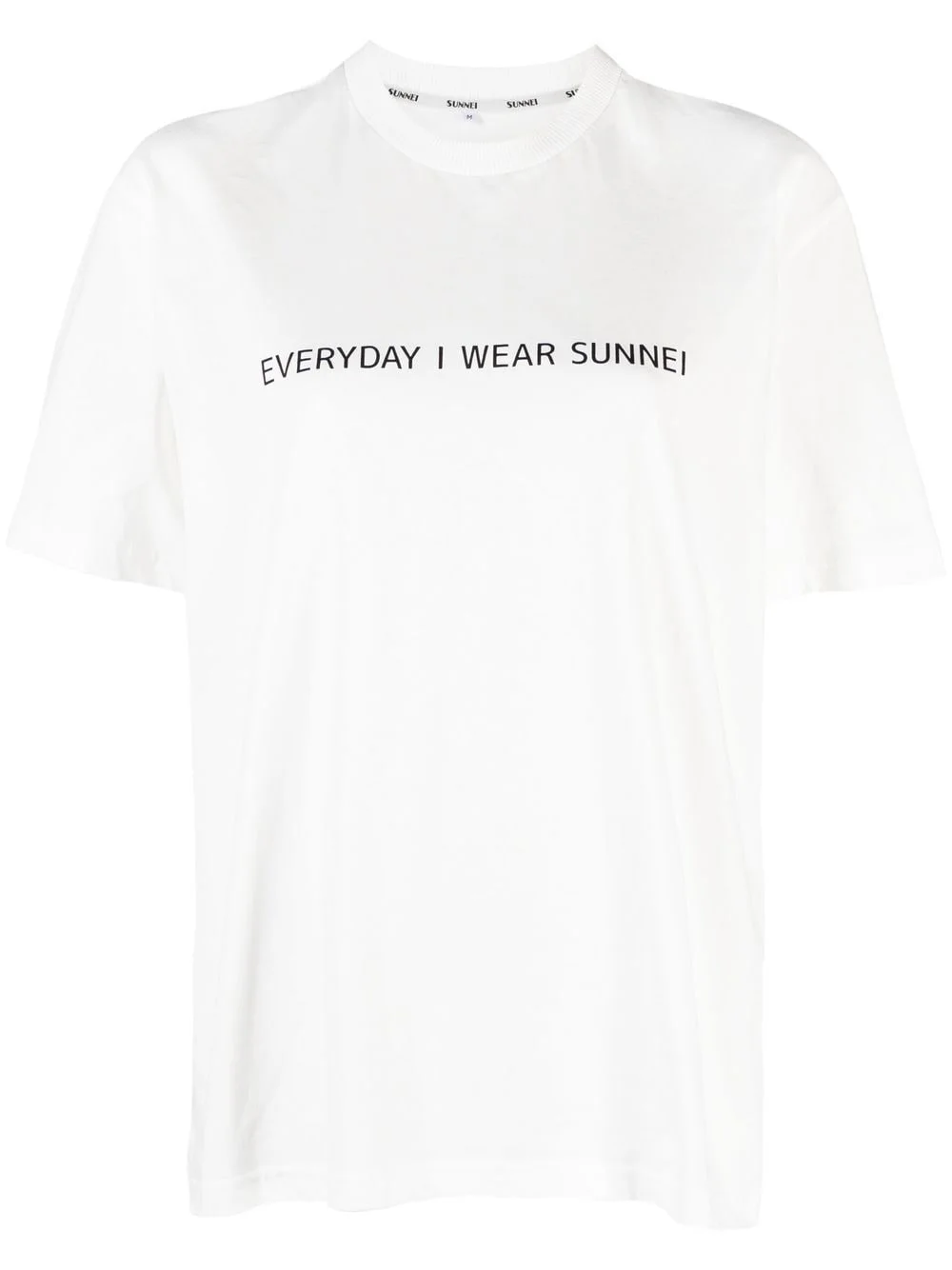 slogan-print cotton T-shirt off-white cotton jersey knit slogan print to the front crew neck short sleeves straight hem Imported Composition Cotton 100% SIZE & FIT Model measurements Height 5 ft 10 in(1.78 m) Bust/Chest 31.49 in(80 cm) Hips 37 in(94 cm) Waist 23.62 in(60 cm) FittingInformation This piece fits true to size. We recommend you get your regular size Cut for a relaxed fit Made with a mid-weight fabric Washing instructions Machine Wash