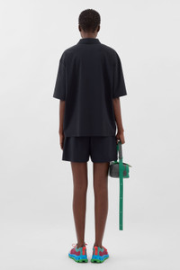 Technical black shortsleeve polo featuring laser cut and glued, waterproof zip on front with SUNNEI puller and SUNNEI box print on chest. 60%NY 40%EL Made in Portugal Chol is wearing a size S. Model measures: Height: 180cm Chest: 79cm Waist: 61cm Hips: 90cm Shoe: 39