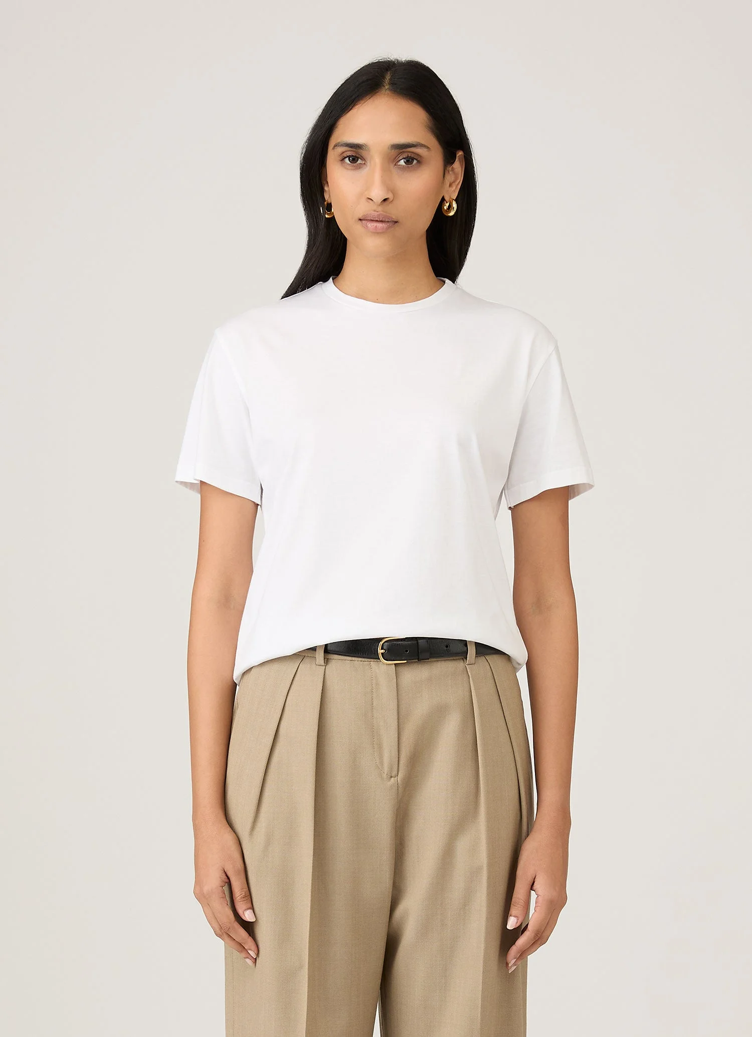 This T-shirt is made with a beautifully soft midweight fabric that’s smooth against the skin and we can trace the Supima cotton to the Californian farm of origin. Cut for a timeless, casual feel, it has dropped shoulders, subtly lengthened sleeves and a clean neckline that sits elegantly against the body. Versatile and long-lasting, we believe this is the perfect T-shirt. Product Code: WTSH0087S-WHAA Fabric & Care - 100% Supima Cotton - Gentle wash at 40°C with similar colours - Do not tumble dry - Do not dry clean - Made in Portugal Size & Fit - Boxy fit - Model is 5'9" and and wears a size S