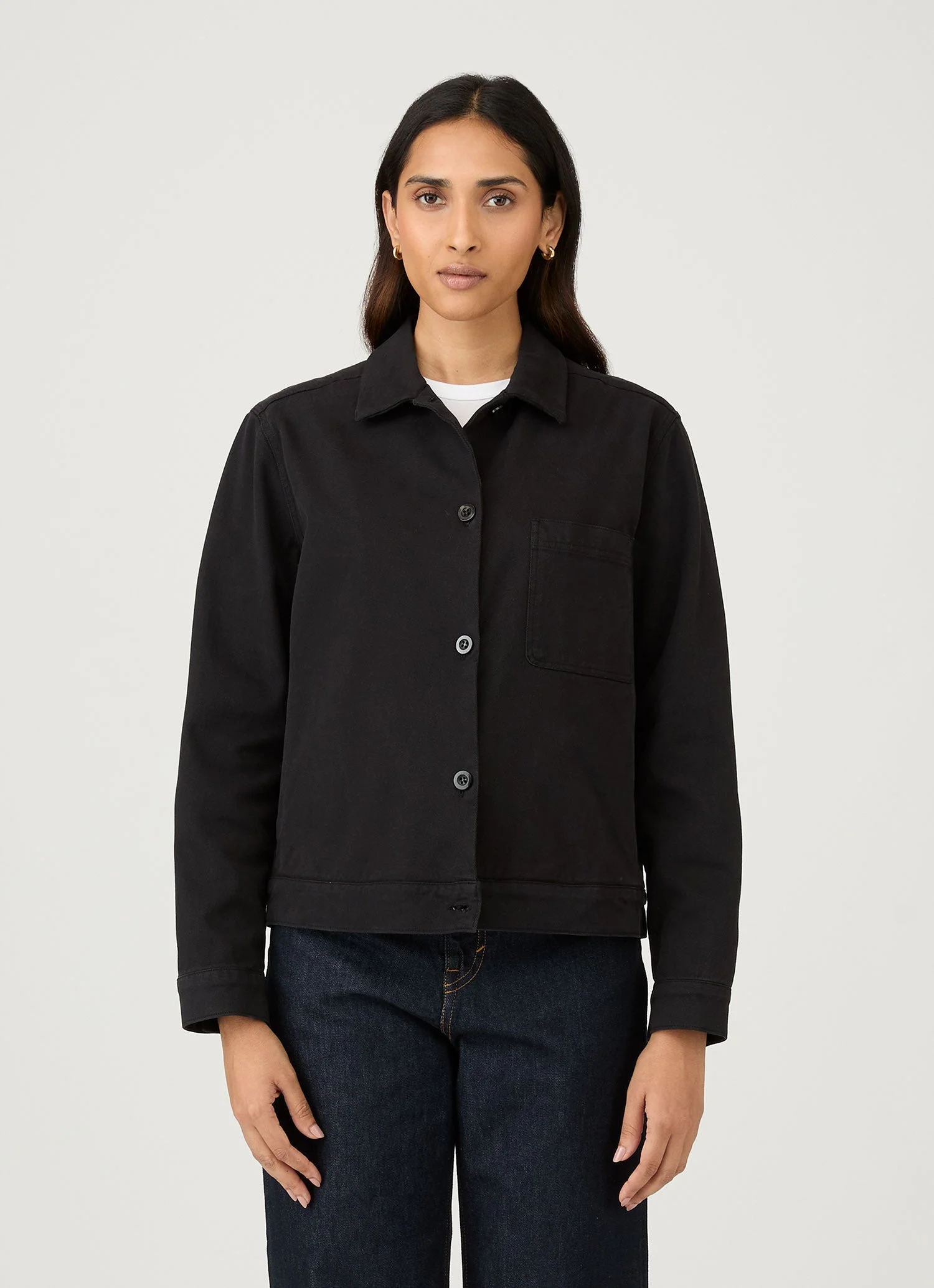 This chore jacket is made from French cotton drill that has been garment dyed to give a broken in feel. A boxy cut, with a neat collar and buttons. A good layering piece that works well with a T-shirt or knit. This is an easy workwear style with matching trousers. Product Code: WJAC7024-BKAA Fabric & Care - 98% Cotton, 2% Elastane - Gentle wash at 40°C - Wash separately - Do not tumble dry - Dry cleanable - Made in Portugal Size & Fit - Boxy fit - Model is 5'9" and wears a size S