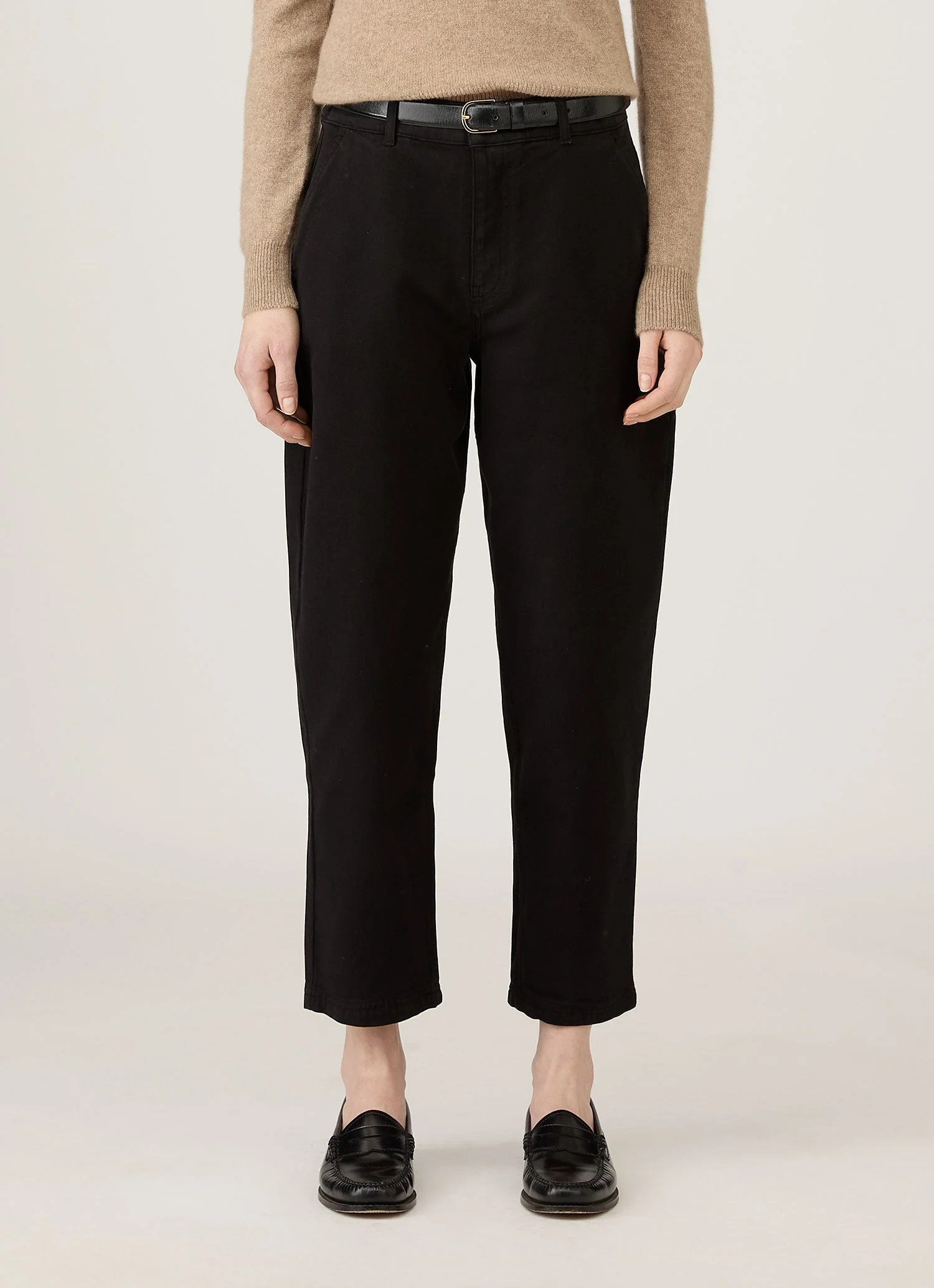 A tapered trouser in French cotton drill, cut to ankle length and garment dyed for a broken in feel. This is an easy workwear style with a matching jacket. Product Code: WTRS3033-BKAA Fabric & Care - 98% Cotton, 2% Elastane - Gentle wash at 40°C with similar colours - Do not tumble dry - Dry cleanable - Made in Portugal Size & Fit - Regular fit - Flat front - Tapered leg - Model is 5'9" and wears a size S