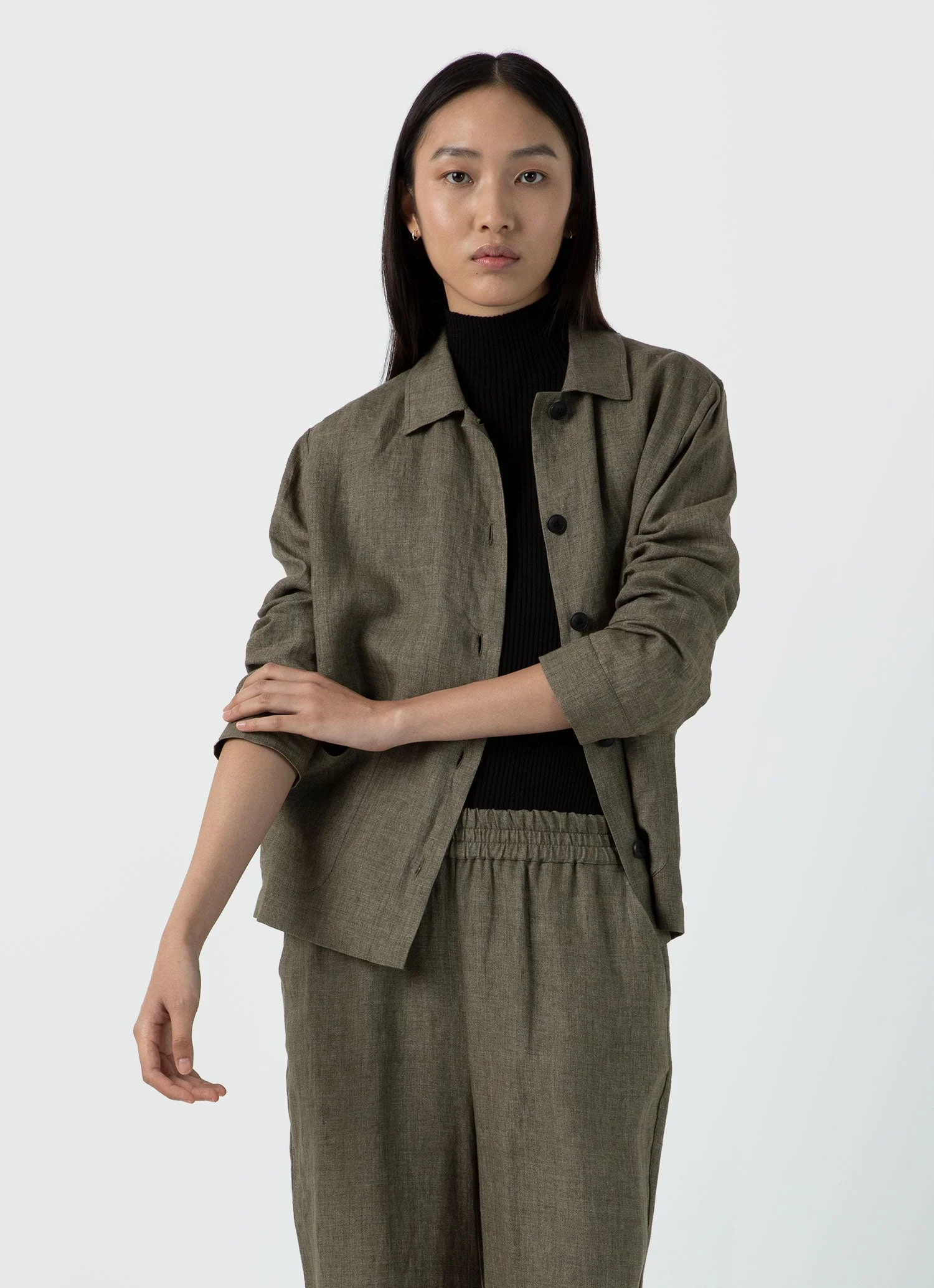 An easy lightweight jacket in pure, very fine Italian linen. This is a relaxed layer for the summer season which makes the perfect linen set when worn with the matching linen trouser. Our Italian linen comes from the Leomaster mill on the banks of Bisenzio river in Prato, located there since the 1950s. The mill specialises in weaving yarn-dyed natural fibres – linen for summer and wool for winter. The fibre itself is sourced from France, known for its exceptionally fine linen. Product Code: WJAC7033-GNGY Fabric & Care - 100% Linen - Fabric by Leomaster, Italy - Do not wash - Do not tumble dry - Dry clean only - Made in Portugal Size & Fit - Boxy fit - Model is 5'10" and wears a size S