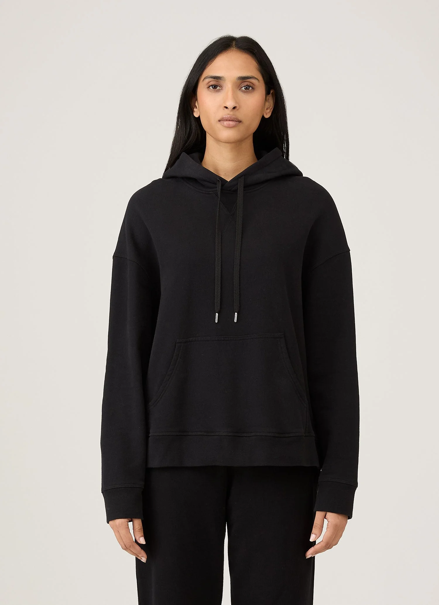 A relaxed-fit overhead hoodie made from our ultra soft signature cotton loopback fabric. A dropped shoulder, ribbed hem and cuffs and classic patch pocket make this a contemporary wardrobe staple. Pair with matching trackpants as part of the track set. Product Code: WSWE1533-BKAA Fabric & Care - Main: 100% Cotton - Ribs: 95% Cotton, 5% Elastane - Gentle wash at 30°C - Do not tumble dry - Do not dry clean - Made in Portugal Size & Fit - Relaxed fit - Model is 5'9" and wears a size S