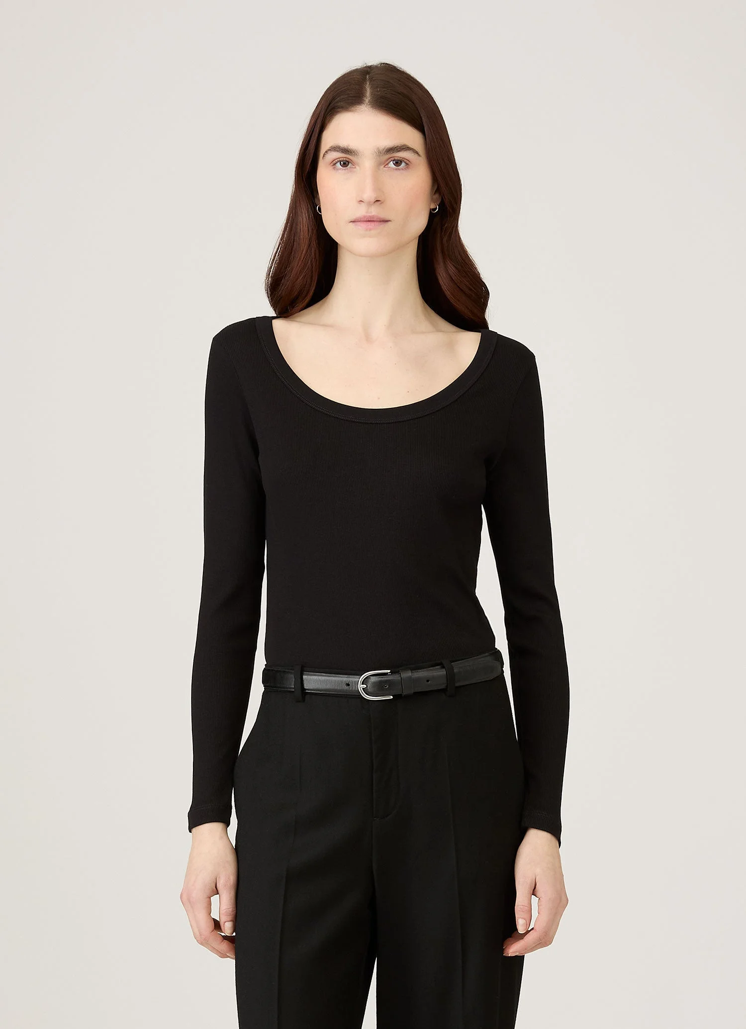 An elegant scoop neck T-shirt crafted from luxurious ribbed jersey made with Californian Supima cotton. With a slim fit and low neckline, it offers exceptional comfort and a sleek, contemporary silhouette – perfect as a refined base layer or a modern standalone piece. Product Code: WTOP2514-BKAA Fabric & Care - 100% Supima Cotton - Cotton is fully traceable and sustainably sourced from California - Cotton is extra-long staple for durability and comfort - Gentle wash at 30°C with similar colours - Do not tumble dry - Do not dry clean - Made in Portugal Size & Fit - Slim fit - Model is 5'11" and wears a size S