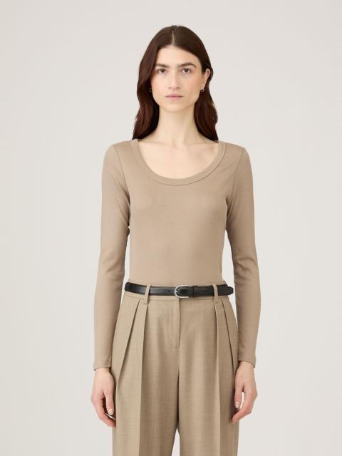 An elegant scoop neck T-shirt crafted from luxurious ribbed jersey made with Californian Supima cotton. With a slim fit and low neckline, it offers exceptional comfort and a sleek, contemporary silhouette – perfect as a refined base layer or a modern standalone piece. Product Code: WTOP2514-BRGB Fabric & Care - 100% Supima Cotton - Cotton is fully traceable and sustainably sourced from California - Cotton is extra-long staple for durability and comfort - Gentle wash at 30°C with similar colours - Do not tumble dry - Do not dry clean - Made in Portugal Size & Fit - Slim fit - Model is 5'11" and wears a size S
