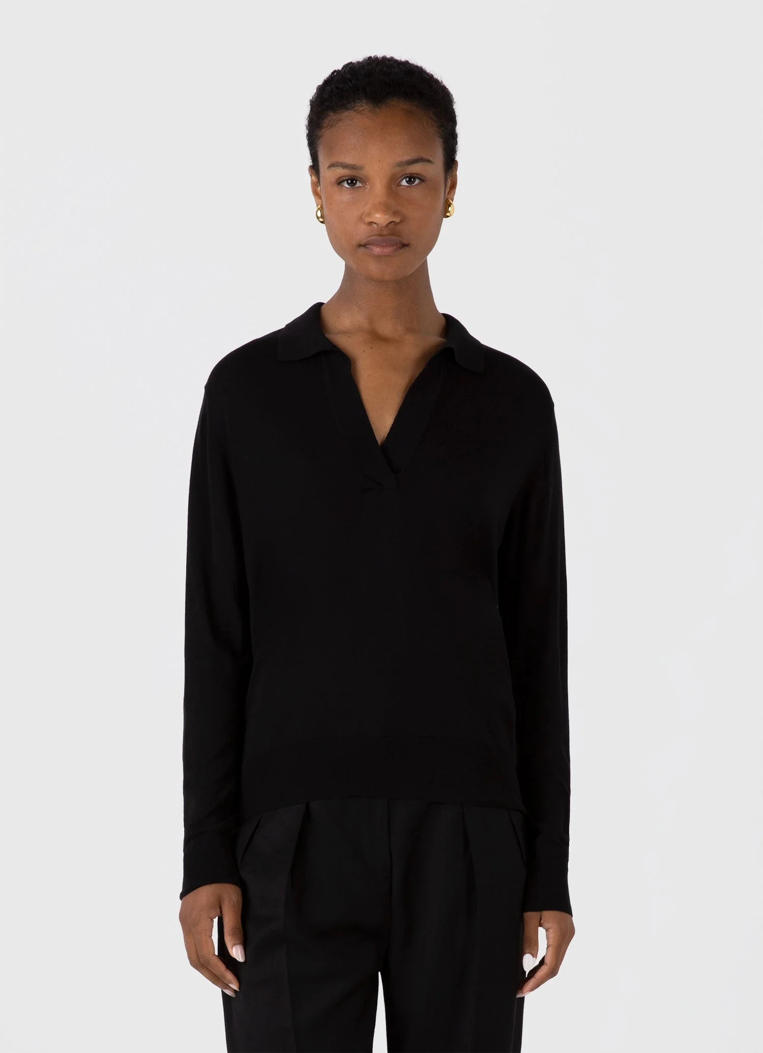 A luxurious fine knit polo, made with beautifully smooth pure Italian-spun mulberry silk. With a regular fit, buttonless placket and clean feminine neckline that’s wide and deep, it is an elegant piece that can be dressed up or down effortlessly. Product Code: WPOL8220-BKAA Fabric & Care - 100% Mulberry Silk - Gentle wash at 30°C with similar colours - Do not tumble dry - Dry cleanable - Made in Portugal Size & Fit - Regular fit - Model is 5'9" and wears a size S (UK 10)