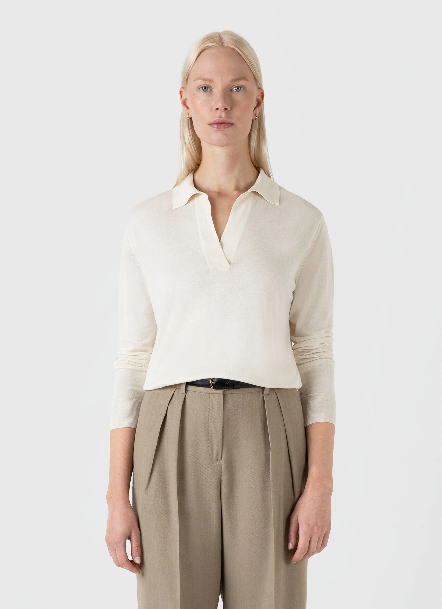 A luxurious fine knit polo, made with beautifully smooth pure Italian-spun mulberry silk. With a regular fit, buttonless placket and clean feminine neckline that’s wide and deep, it is an elegant piece that can be dressed up or down effortlessly. Product Code: WPOL8220-WHCR Fabric & Care - 100% Mulberry Silk - Gentle wash at 30°C with similar colours - Do not tumble dry - Dry cleanable - Made in Portugal Size & Fit - Regular fit - Model is 5'11" and wears a size S (UK 10)