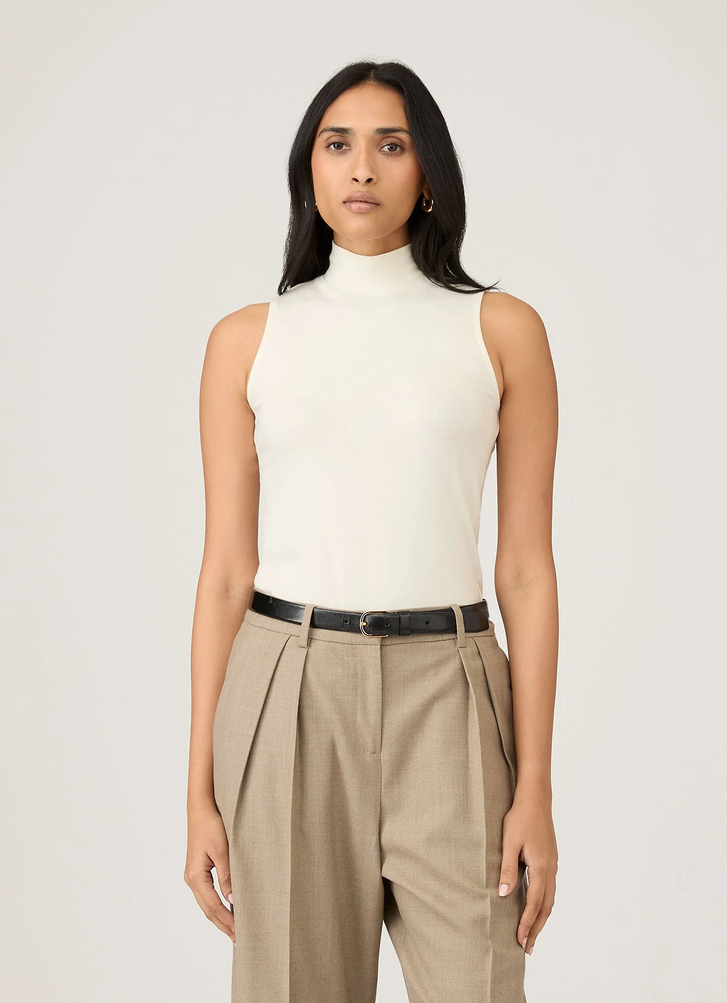 Crafted from a beautifully soft cotton jersey that has a slight stretch for added comfort, this sleeveless top has a feminine, body-hugging silhouette with an elegant high neck. It's a flattering, versatile piece that can be worn casually or dressed up for a smarter look. Product Code: WTOP2504-WHCR Fabric & Care - 94% Cotton, 6% Elastane - Gentle wash at 30°C with similar colours - Do not tumble dry - Do not dry clean - Made in Portugal Size & Fit - Slim fit - Model is 5'10" and wears a size S