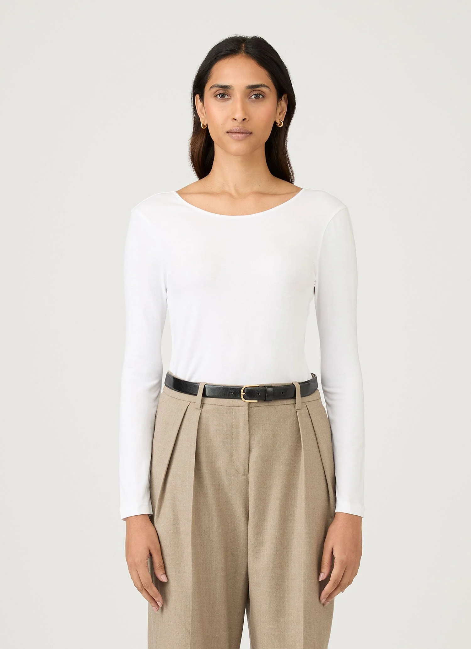 Crafted from a beautifully soft cotton jersey with a slight stretch for added comfort, this top has a feminine, body-hugging silhouette and an elegant scoop back neckline. An effortless standalone layer that can also be layered under a shirt or cardigan. Product Code: WTOP2503-WHAA Fabric & Care - 94% Cotton, 6% Elastane - Gentle wash at 30°C with similar colours - Do not tumble dry - Do not dry clean - Made in Portugal Size & Fit - Slim fit - Model is 5'11" and wears a size S (UK 10)