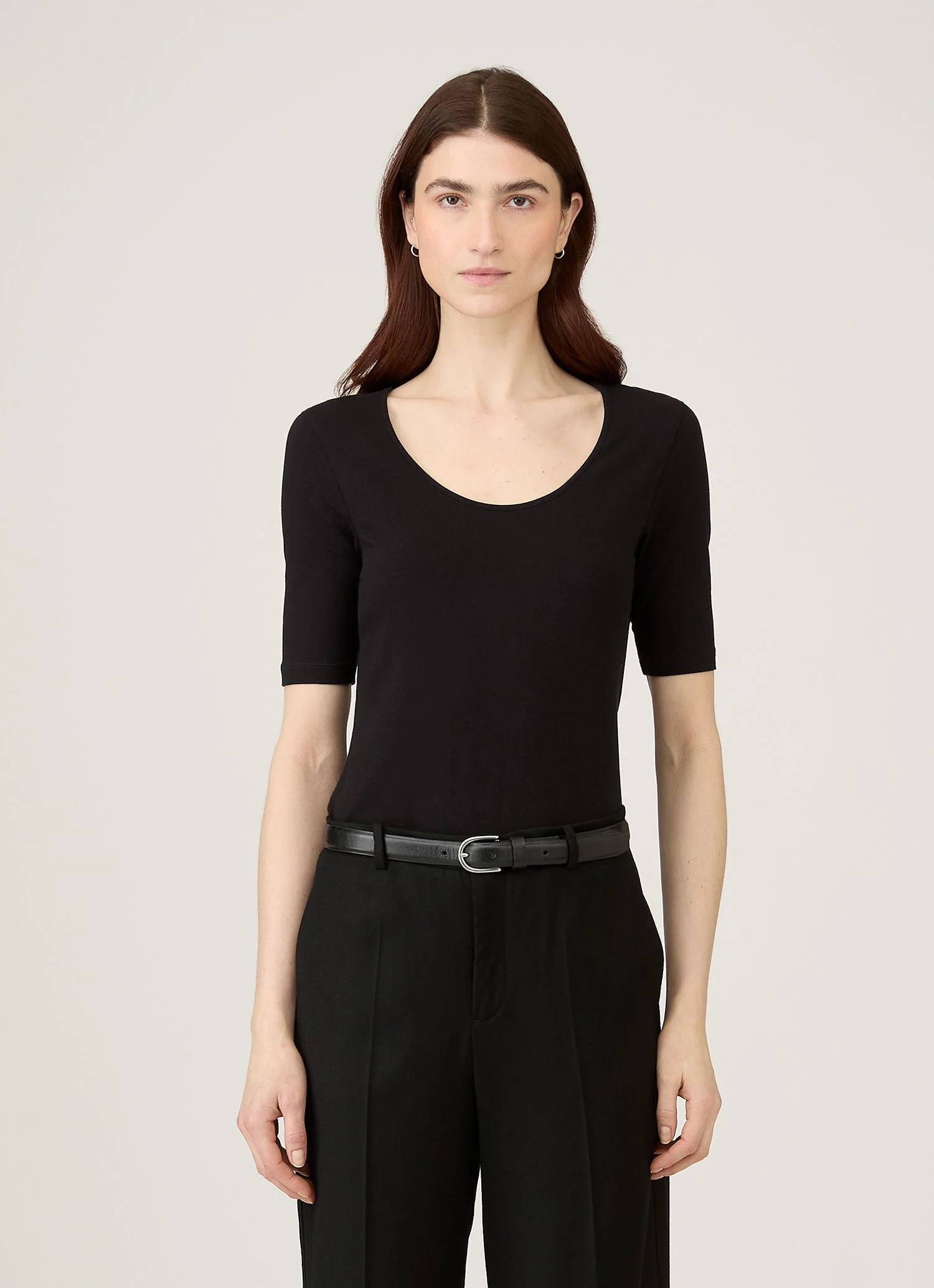 An elegant scoop-neck top crafted in a cotton jersey with a slight stretch for added comfort. With a slim fit, it is versatile and contemporary, transitioning seamlessly between day and evening. Product Code: WTOP2507-BKAA Fabric & Care - 94% Cotton, 6% Elastane - Gentle wash at 30°C with similar colours - Do not tumble dry - Do not dry clean - Made in Portugal Size & Fit - Slim fit - Model is 5'11" and wears a size S (UK 10)
