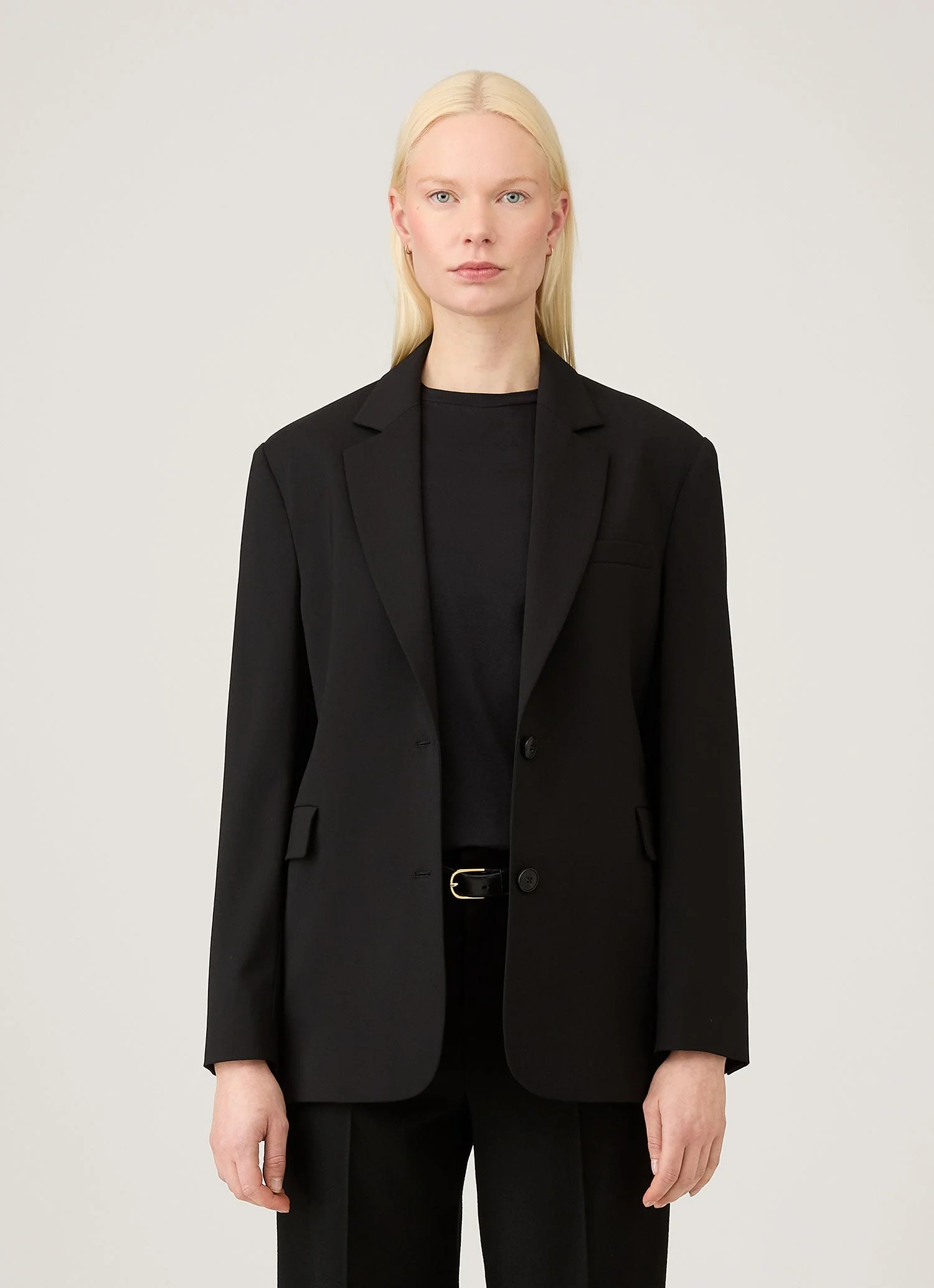 A versatile blazer crafted from luxuriously soft Italian wool and woven with elastane for a slight stretch and added comfort. It is unstructured and has a relaxed fit and elongated proportions, making it sharp and contemporary. This is a smart casual essential that can be worn over a T-shirt or with the matching trouser for a complete suit. Product Code: WJAC7037-BKAA Fabric & Care - 95% Wool, 5% Elastane - Horn buttons - Do not wash - Do not tumble dry - Dry clean only - Made in Portugal Size & Fit - Relaxed fit - Model is 5'10" and wears a size S