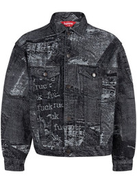 Archive denim trucker jacket Another highlight of Supreme's streetwear collection, this denim jacket is printed with an all-over graphic motif. It's cut from grey denim and complete with a faded effect that gives it a love-worn quality. Highlights - Black - Denim - All-over graphic print - Faded effect - Classic collar - Front button fastening - Long sleeves - Two chest flap pockets - When buying this unisex item, keep in mind that it is graded in standard men's sizing Imported Composition Denim 100%