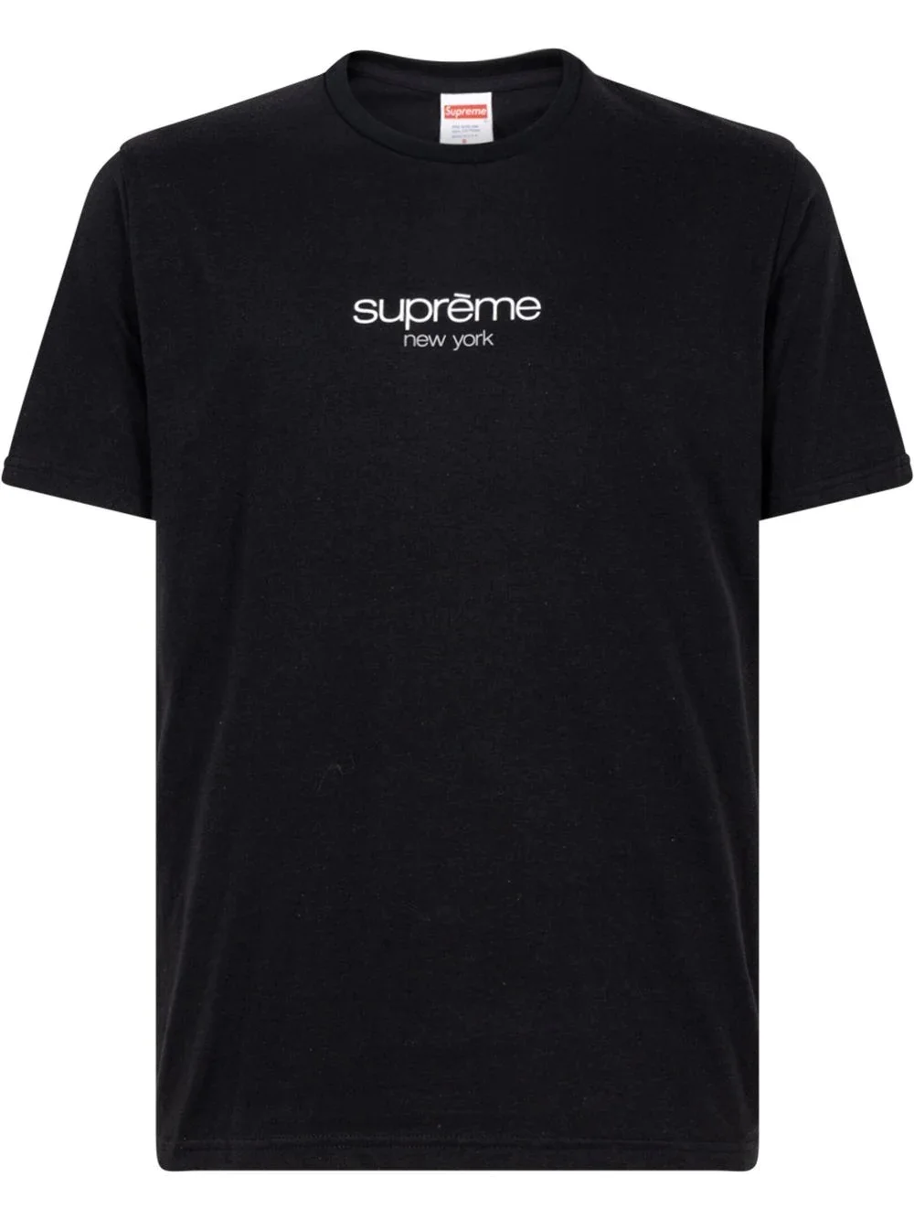 Classic Logo crew neck T-shirt The Supreme classic logo tee “Black” is a minimalist, all-cotton short-sleeve T-shirt by the 'World Famous' streetwear brand. This piece was originally released back in 1998 and later revived by the brand for its AW22 collection. Inspiration for Supreme’s Classic Logo is derived from Courreges, a French clothing brand owned by Andres Courreges. Made in United States Composition Cotton 100%