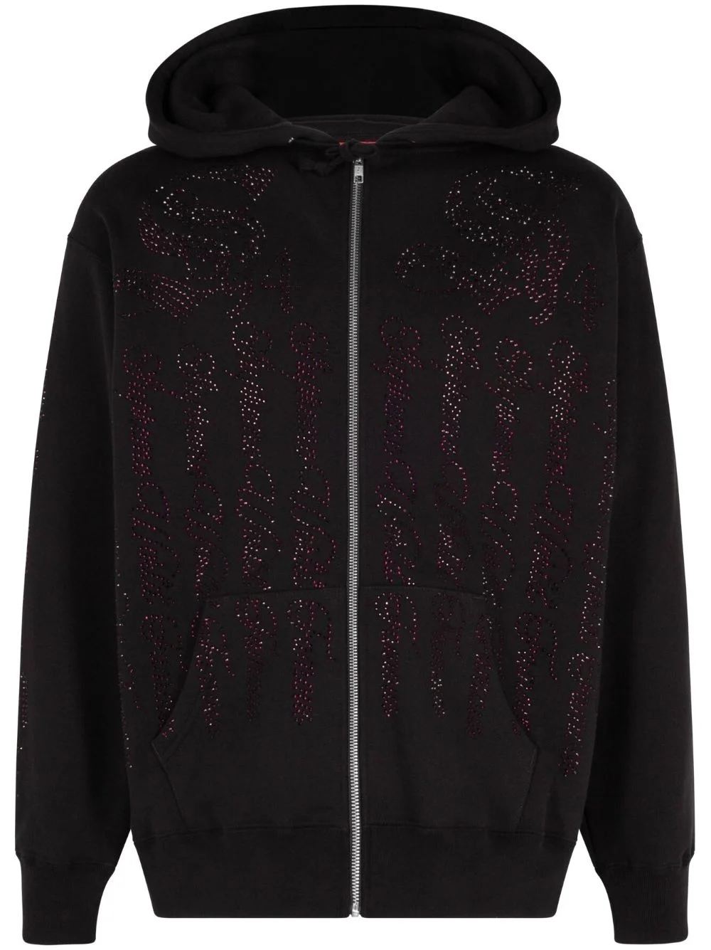 crystal-embellished hoodie Highlights - Black - Crystal embellishment - Logo embellishment - Drawstring hood - Front zip fastening - Drop shoulder - Long sleeves - Two front pouch pockets - Ribbed cuffs and hem - When buying this unisex item, keep in mind that it is graded in standard men's sizing. Imported Composition Rhinestone 100%, Fabric 100%